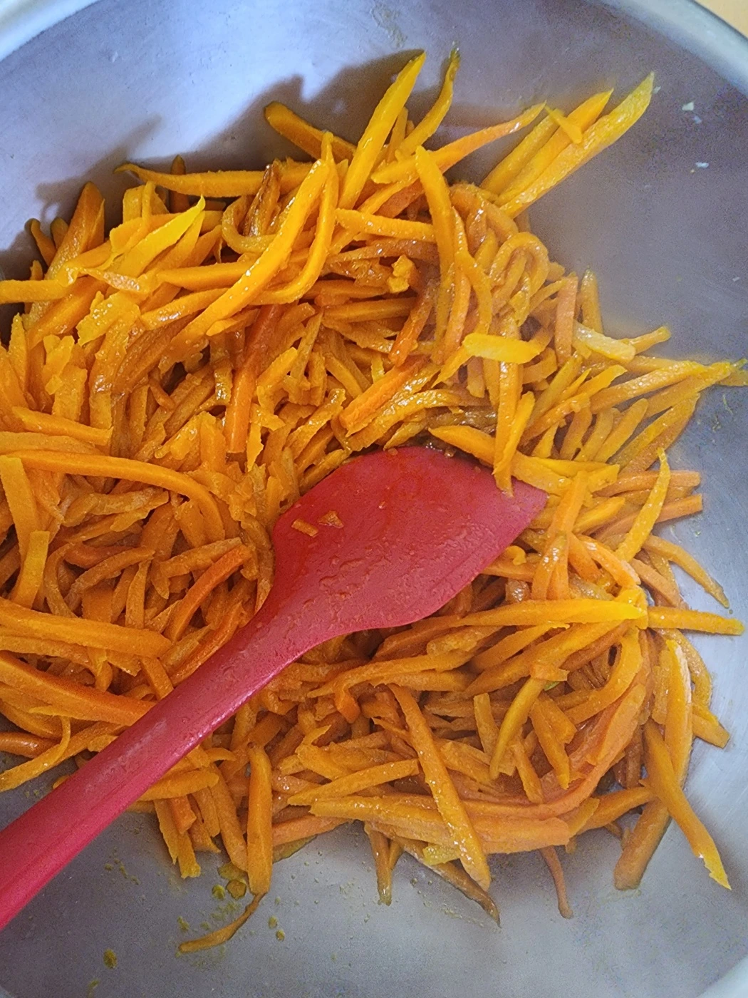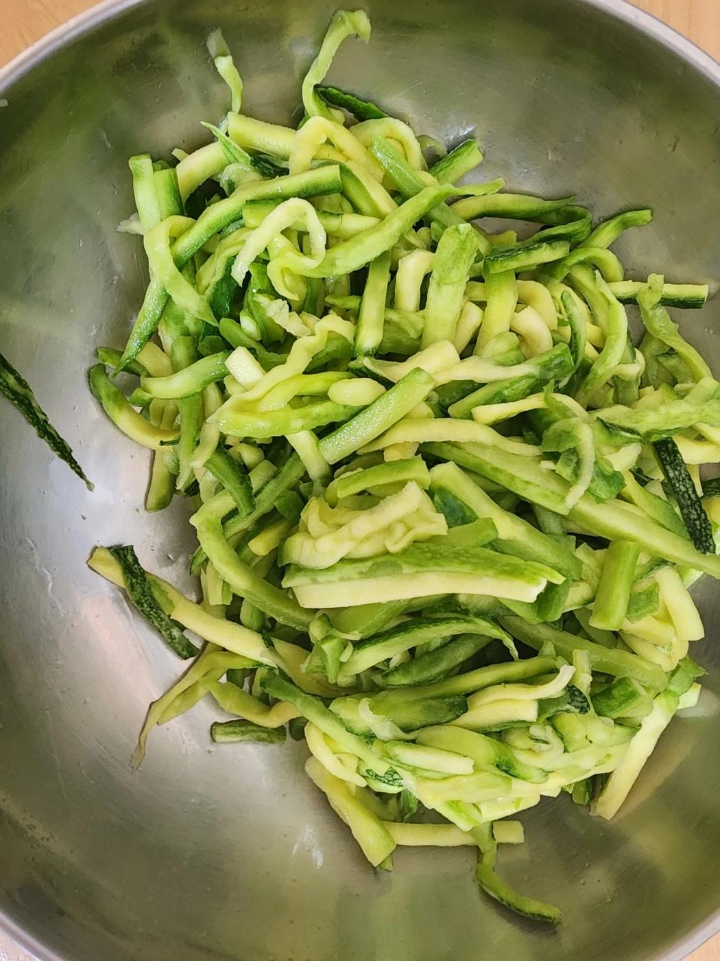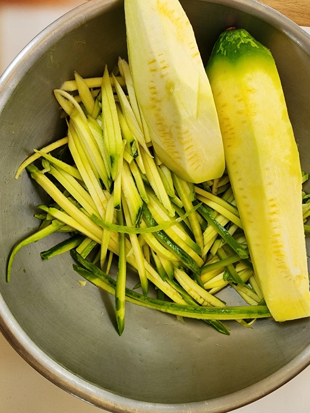 수줍은 애호박과 늠름한 당근이 만나 색감과 맛은 고소함 그 자체랍니다. 먼저 애호박과 당근은 채칼을 이용해서 썰어주세요. 요리에 힘든 일은 도구에게 양보하세요. 애호박은 볶을 때 물이 생길 수 있으니 수분이 다 날아가도록 약한 불에 꼭 볶아주세요. 당근과 계란만 준비하고 단무지와 햄, 우엉은 금방 준비해서 김밥 싸보았어요.