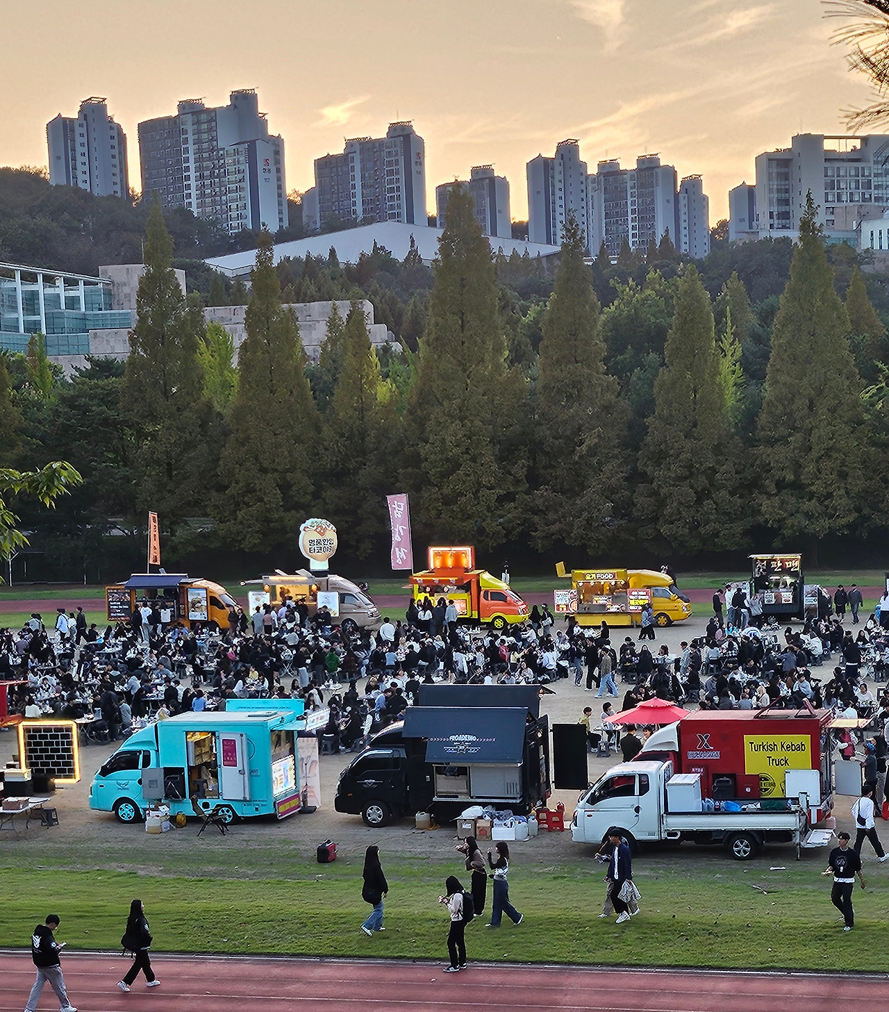 푸드 트럭이 즐비하게 들어서고 삼삼오오 편한 자리에 까르르 웃음소리와 캔맥주를 마시는 청년들이 눈에 들어왔다. 해맑은 청년들만 보아도 기분이 좋았다. 청년들의 나이에 곱하기 2를 해야 내 나이가 되지만 같은 공간 같은 학생이니 곱하기 2를 지우고 오늘은 20대가 되어보고 싶었다. 음악소리에 설렌건지 스무 살이라고 주문을 걸어 마법에 빠졌는지 늦깎이 학생인 나는 푸드트럭에서 맛있어 보이는 음식을 용기 내 사보았다. 혼자 밖에서 음식을 사서 먹는건 처음이었다. 넓은 운동장에 나를 신경쓸 사람이 없으니 편한 마음으로 학교 내 편의점으로 음료를 사러 갔다.