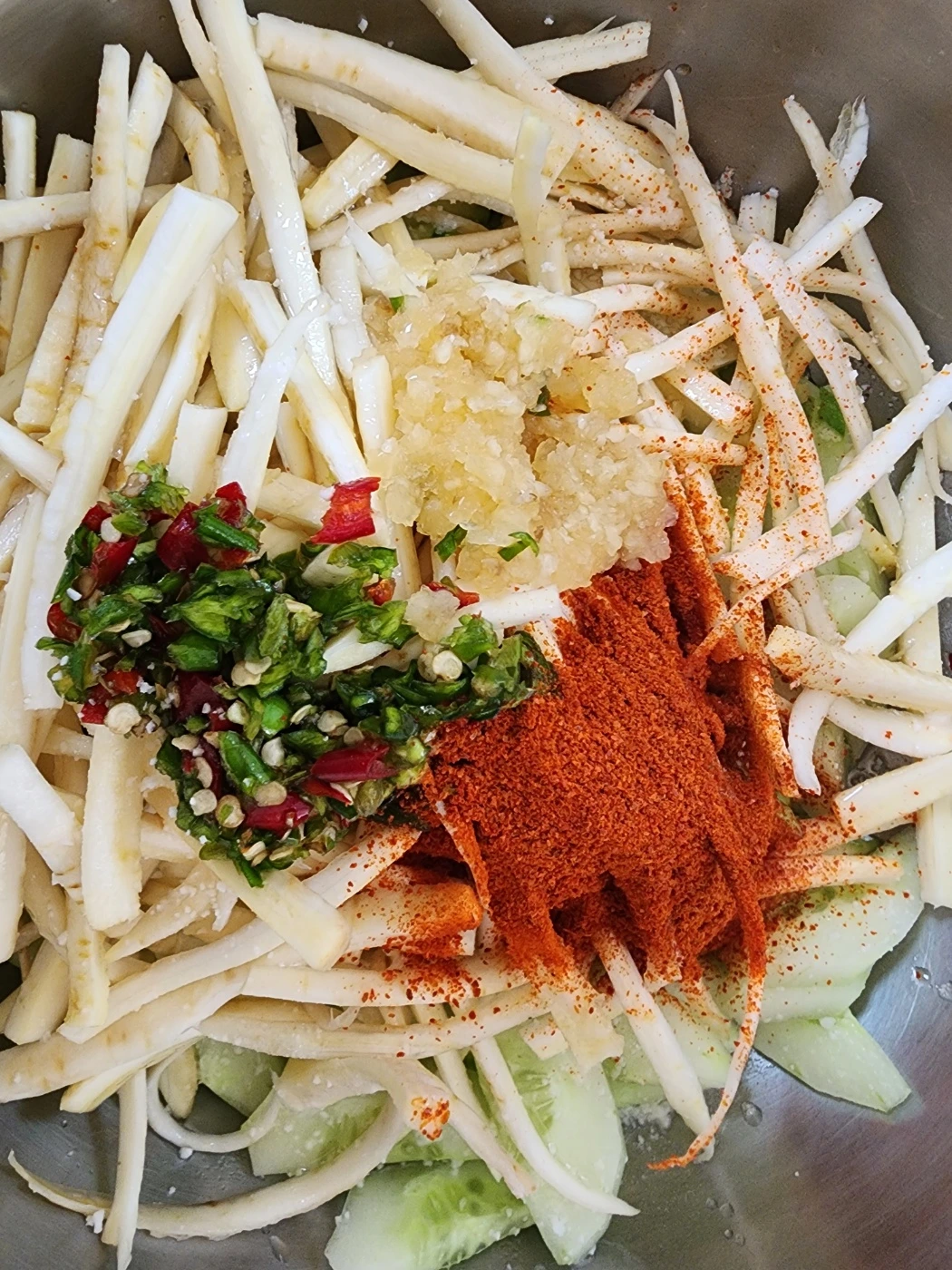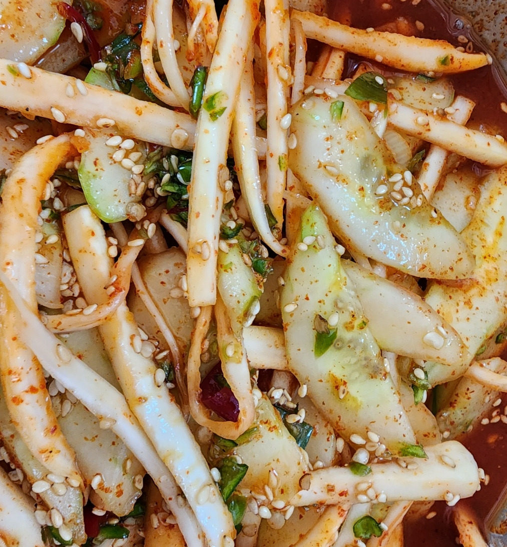 도라지는 소금물에 박박 주물러 도라지의 쓴맛을 빼주고 찬물에 씻어 물기를 빼주세요. 오이는 취향대로 잘라 소금에 살짝 절였다고 힘껏 짜주면 좋답니다.