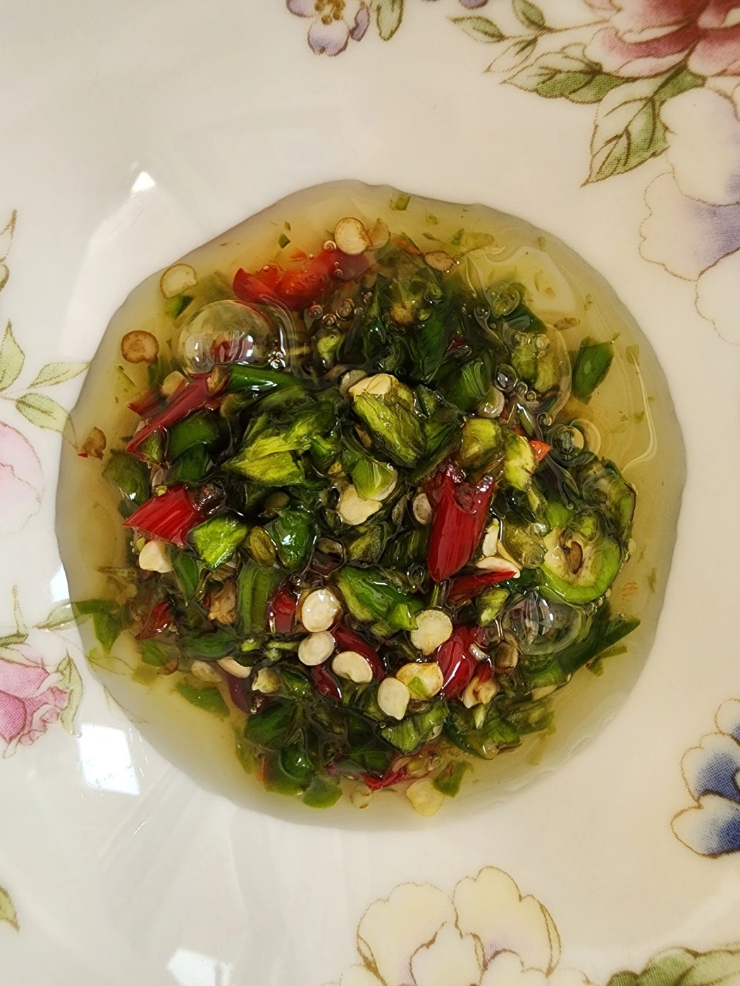 식초, 고춧가루 올리고당, 여름에 준비했던 청양 고추청, 참기름, 다진 마늘을 넣어 양념장을 준비해 주세요. 양념장과 도라지, 오이를 박박 주물러서 무쳐주면 맛있답니다. 도라지 진액이 나오게 사정없이 팍팍 무쳐주면 도라지가 살짝 더 부드러워져요.