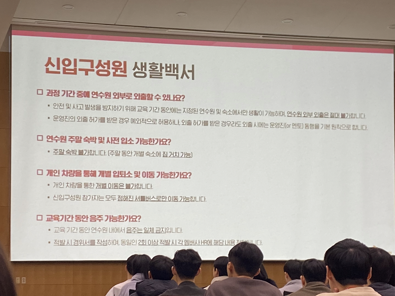 신입사원인 만큼, 기업의 경영철학을 주입식 교육을 통해 가르친다. 구성원으로서 같은 방향성을 바라보고 나아가야 기업의 문화가 유지되고 하나로 성장해 나갈 수 있기 때문이다.