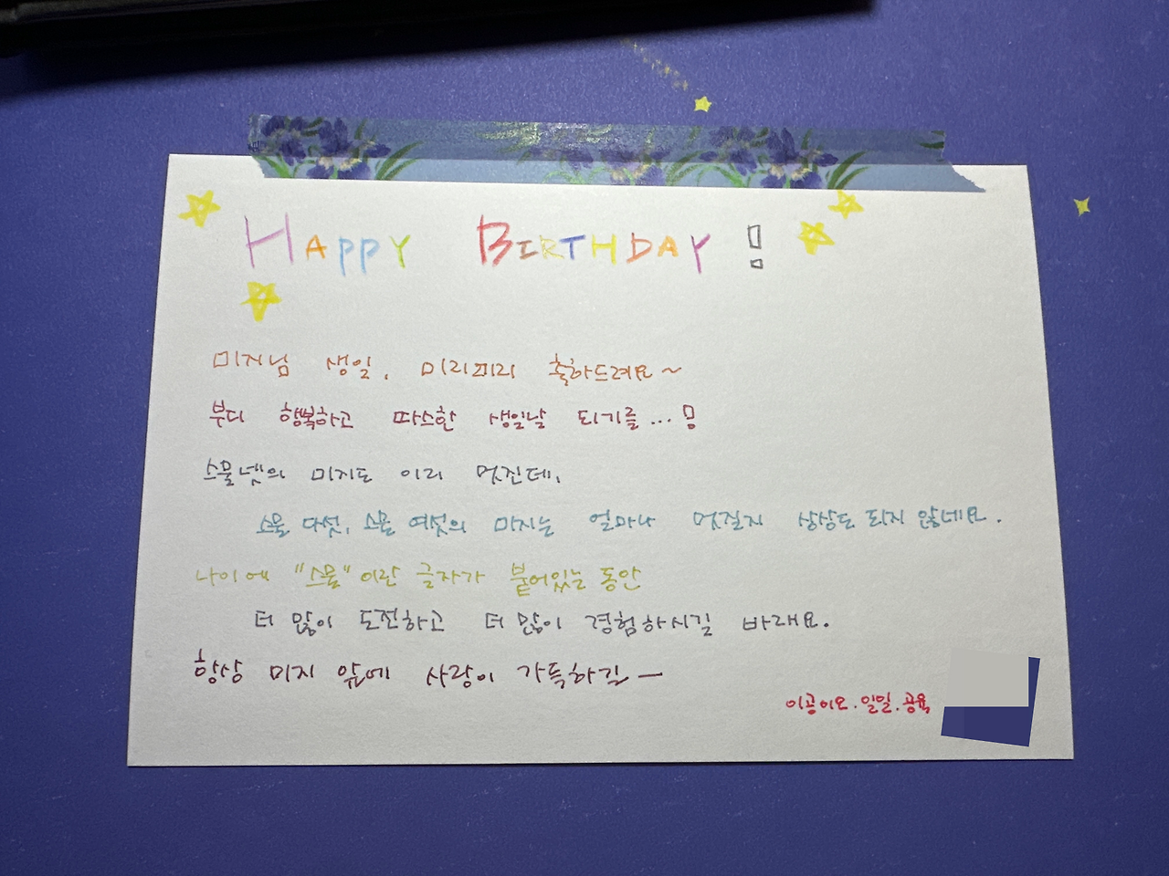 생일 자정에 (정말 너무 감사하게도) 나한테 제일 먼저 생일축하를 하겠다고 대기 타고 있는 친구들이 있어서 평소 같으면 이미 잘 시간이지만 답장을 해주기 위해 안 자고 기다렸다. 미리 받은 편지와 새벽에 온 연락들을 읽으며 행복한 하루를 시작할 수 있었다.