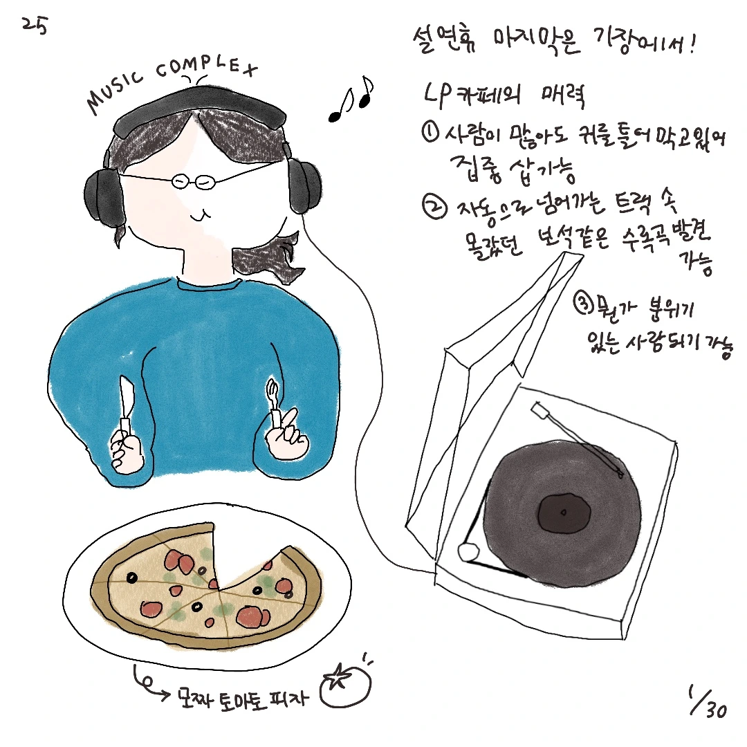 갈수록 북적함보다 조용함을 찾아다니게 되는데 LP 카페는 내가 찾는 조용함을 실컷 즐길 수 있는 곳인 것 같다. 이때 내가 찾는 조용함은 소리가 없는 조용함이라기보다 주변환경에 방해받지 않고 내가 좋아하는 소리와 좋아하는 일에 집중할 수 있는 그런 조용함이다. 귀에서는 내가 좋아하는 노래가 흘러나오고 맛있는 걸 먹거나 책을 읽거나 작업을 하거나 아무것도 안 하거나. 요즘 나의 소소한 행복