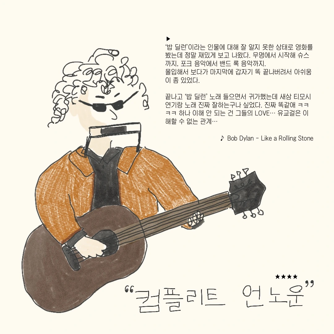 끝나고 ‘밥 딜런’ 노래 들으면서 귀가했는데 새삼 티모시 연기랑 노래 진짜 잘하는구나 싶었다. 진짜 똑같애 ㅋㅋㅋㅋ 하나 이해 안 되는 건 그들의 LOVE… 유교걸은 이해할 수 없는 관계…