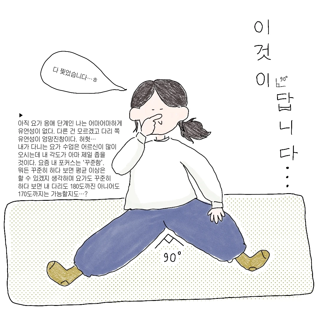 아직 요가 응애 단계인 나는 어마어마하게 유연성이 없다. 다른 건 모르겠고 다리 쪽 유연성이 엉망진창이다. 허헛… 내가 다니는 요가 수업은 어르신이 많이 오시는데 내 각도가 아마 제일 좁을 것이다. 요즘 내 포커스는 ‘꾸준함’. 뭐든 꾸준히 하다 보면 평균 이상은 할 수 있겠지 생각하며 요가도 꾸준히 하다 보면 내 다리도 180도까진 아니어도 170도까지는 가능할지도…?