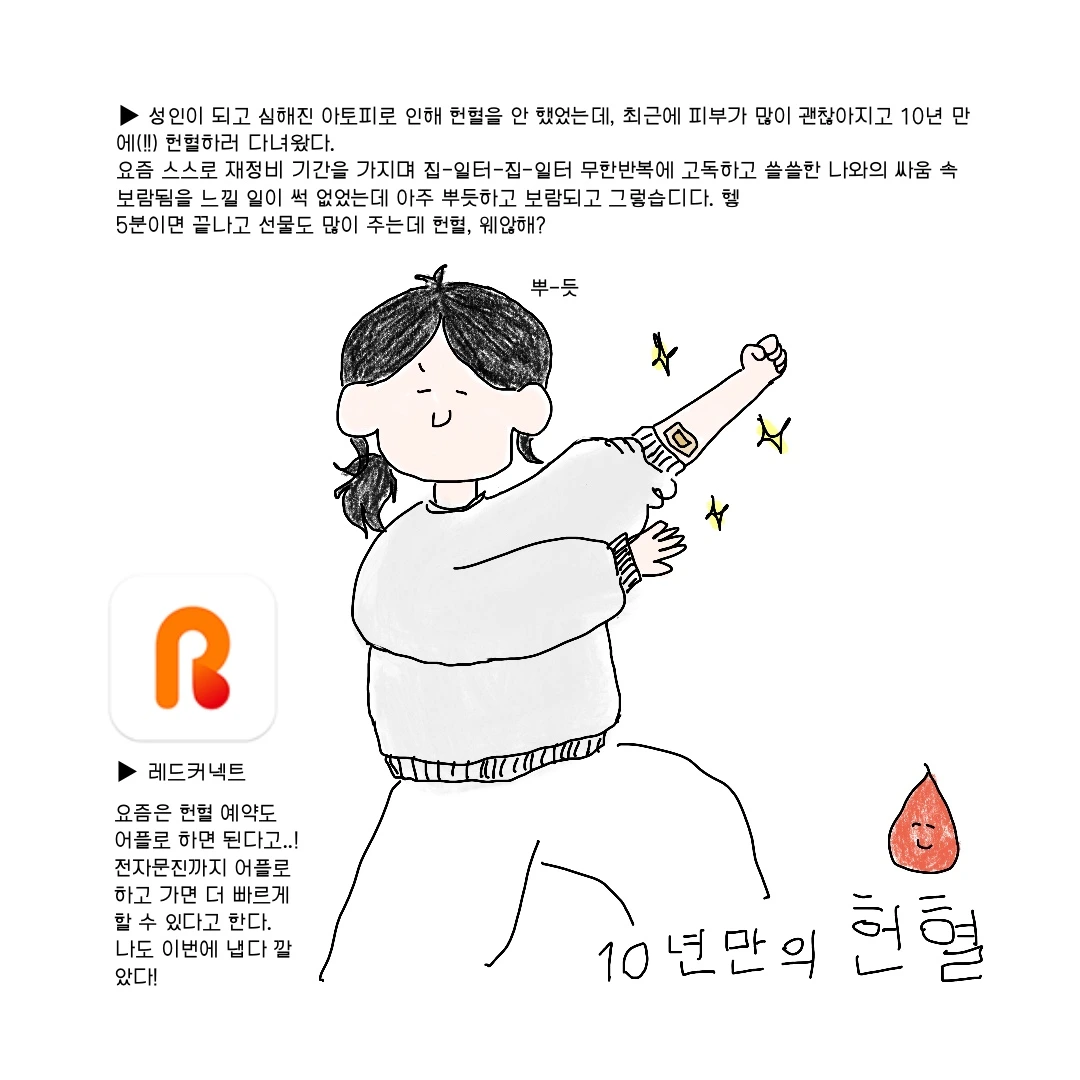 성인이 되고 심해진 아토피로 인해 헌혈을 안 했었는데, 최근에 피부가 많이 괜찮아지고 10년 만에(!!) 헌혈하러 다녀왔다.