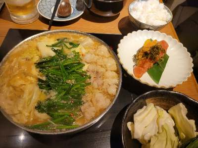 모츠라베 정구지가 익어들어가면서 국물도 끊기 시작을 했다. 직원이 오더니 죽자로 정구지를 눌러서 담구는 시늉을 했고 우리도 그렇게 했다. 그리고 인덕션 불 세기를 낮추고 양배추, 버섯, 우엉, 두부 등과 함께 곱창를 먹었다. 국물도 부드러웠고 곱창의 식감도 쫄깃쫄깃하면서 야채들도 적당이 익어서 너무 맛있었다. 식당에서 대기하는 것을 싫어나는 나는 대기한 보람을 느끼게 해주었다. 맥주와 사케, 야채 추가 주문하여 정말 맛있는 저녁을 과식하여 먹었다.