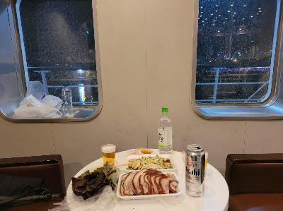 저녁을 먹기위해 5층으로 올라갔고 초량 시장에서 사온 족발, 여객 터미널 편의점에서 산 소주, 선내 자판기에서 구매한 아사이 맥주와 컵라면으로 창밖을 보면서 저녁을 먹었다.