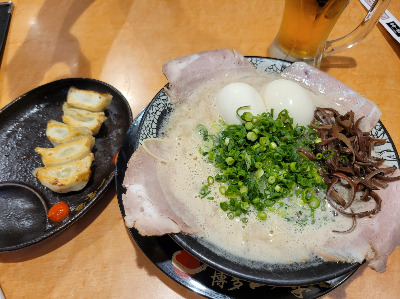 20~30분 정도 기다리고 자리를 안내 받았다. 키오스크로 라멘, 교자, 맥주를 시켰다. 라멘에는 파와 고기, 계란을 추가 주문을 했다. 먼저 맥주가 나와서 시원하게 한잔을 한 후 라멘과 교자를 먹었다. 와이프로 짜지 않아서 너무 맛있다고 했고 나도 너무 맛있게 먹었다.