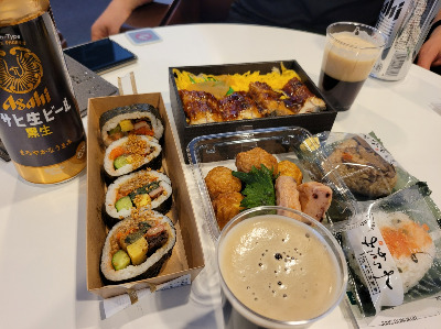 수속을 마친 출국장에도 캐리어로 줄을 세워두고 면세점에 사람들이 북적되고 있었다. 부산항 출국장 면세점에는 사람들이 별로 없었는데 후쿠오카 항에는 작아서 그런지 사람들이 북적되는 것 같다. 그리고 한국 담배는 안 파는 것으로 생각을 했는데 한국 담배도 다양하게 팔고 있었다. 우리는 생초코렛을 샀고 게이트가 오픈되어 승선을 했다. 다행인 것은 우리 객실은 다인실 300번이고 계단하나만 올라가면 되었다. 객실에 짐을 두고 5층 테이블에 자리를 잡았다. 하카타 터미널에서 사온 도시락과 여객선 안에 있는 자판기에서 아사이 일반맥주와 흑생맥주를 사와서 점심상을 차렸다.