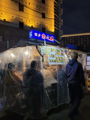 꼬치 앞 부분은 까막게 탔고 명란은 덜 익혀서 나왔다. 그나마 곱창 전골은 맛이 있었는데 국그릇에 담아줘서 양이 너무 작았다. 그리고 음식하는 직원이 받침대가 있는 A4용지에 주문을 받고 돈도 받으면서 요리를 하고 있었다. 음식을 거의 다 먹어갈때 쯤 다른 직원이 와서 먼저 계산하라고 했다. 어찌 이런 경우가 있는지 정말 다시는 오고싶지는 않았고 비추이다. 여러 포장마차 중에 한곳만 가서 다른 곳은 어떻는지는 모르겠다. 가격도 비샀다. 부산의 해운대 포장마차와 여수의 포장마차 거리와 비교했는데 깡패 수준의 포장마차였다. 그래도 방문한 것을 기록하기 위해 사진 한 컷하고 텐진 시내쪽으로 갔다.