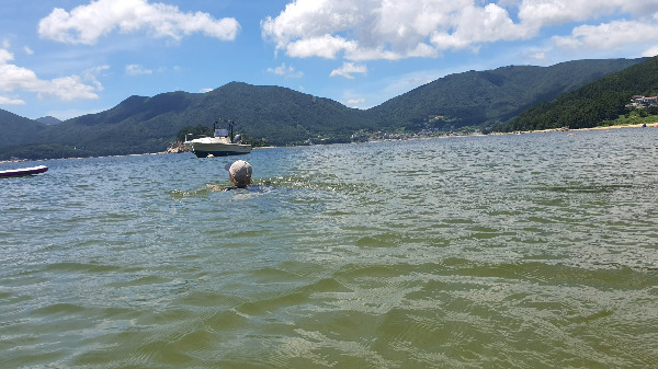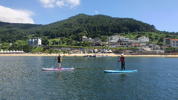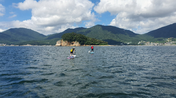오전 10시에 예약하여 10분 전에 도착했다. 보드, 패들, 구명조끼 등을 대여받았고 간단히 강습 후에 바다로 들어갔다. 같이 간 와이프와 딸도 광안리 해변에서 SUP을 여러 번 탔기 때문에 금방 적응할 수 있었다. 그런데 보트와 패들이 다소 오래되어 광안리의 장비들보다는 비교적 좋은 상태는 아니었다. 주위에 민박 집이 많아서인지 야외 샤워장이 있었고 실내 사워장은 화장실로 사용하는 샤워장 하나만 있어서 민박을 하지 않은 경우에는 다소 불편할 것 같았다.