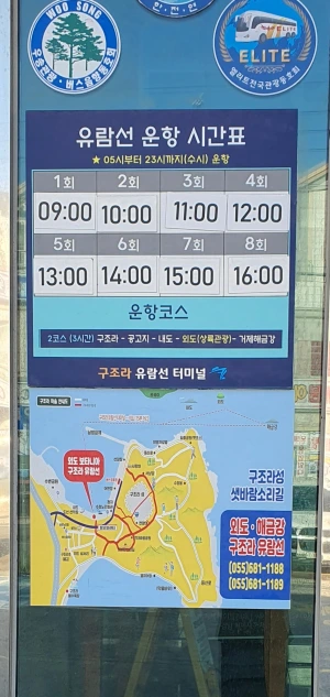 숙소로 돌아와서 땀을 식히고 아침식사를 하기 위해 구조라 유람선 터미널 근처로 갔다. 시간은 대략 7시 30분쯤에 도착했고 아침식사 가능한 식당이 몇 군데 있었다. 구조라 유람선 터미널은 오전 9시부터 1시간 간격으로 운항을 했는데, 내도와 외도, 해금강까지 운항하고 있었다. 예전에 오전 유람선을 탔는데, 파도가 세고 높아서 뱃멀미로 고생한 기억이 났다.