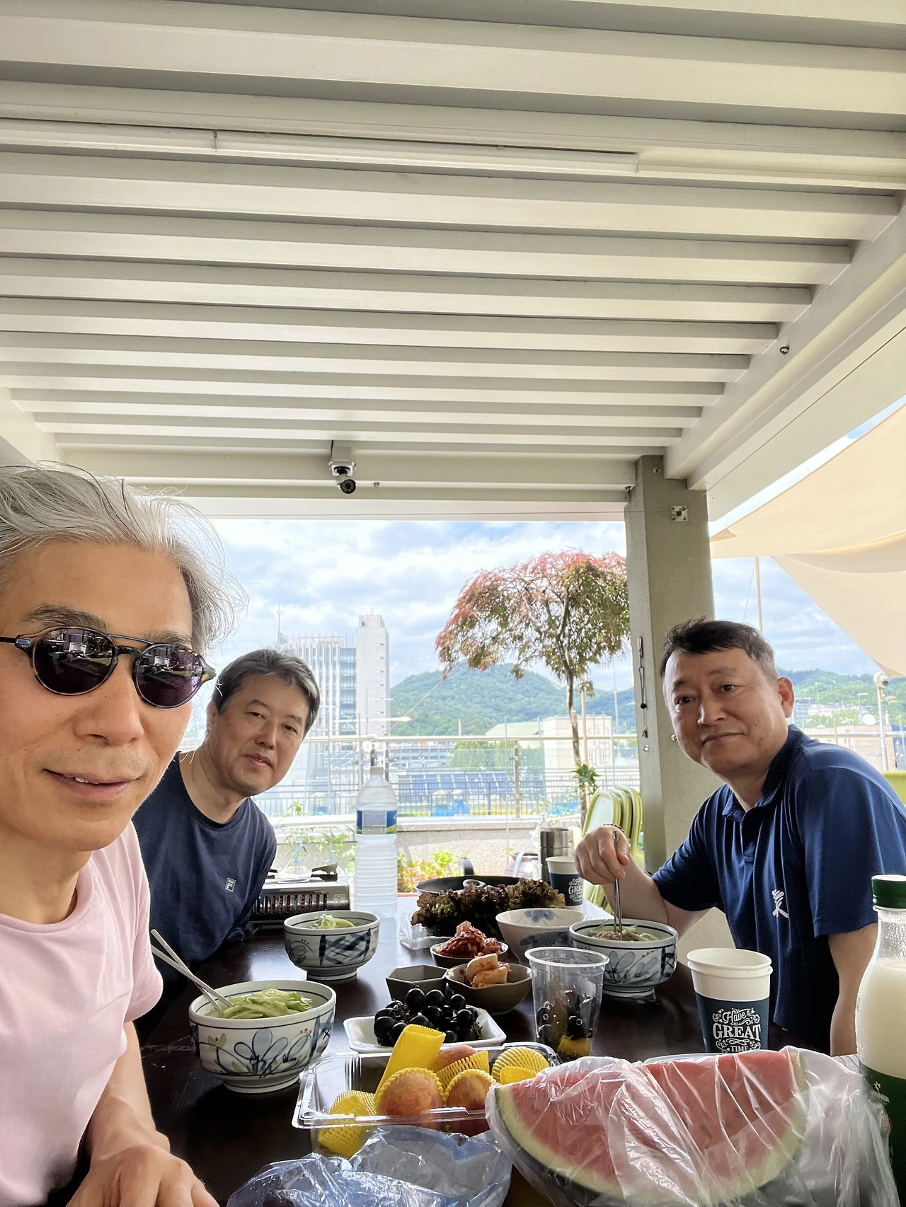 정상에서 내려온 후, 성재형 집에서 점심. 과일의 계절이 성큼 다가왔다.