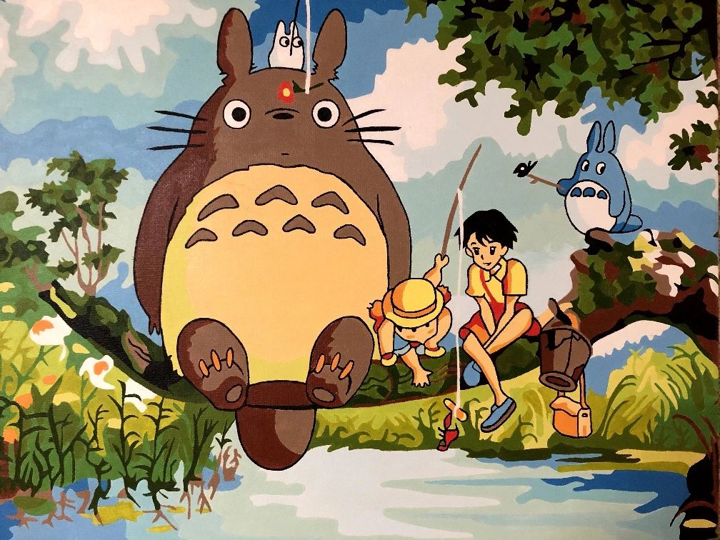 경쾌한 여름날 개울가에 앉아서 토토로와 소녀들이 낚시를 하는 모습이었다. 청량하고 평화로운 모습에 기분이 절로 좋아졌다.