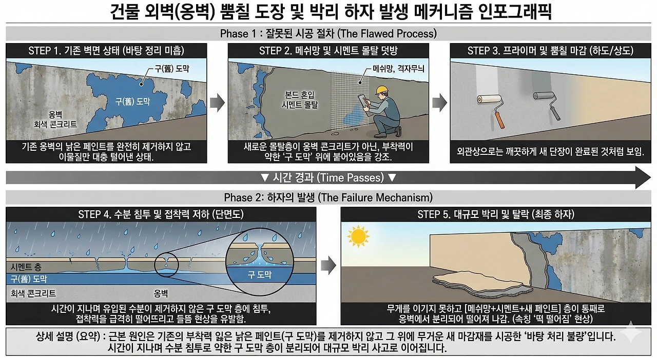 관리동 외벽 옹벽을 새로 단장한다며 대대적인 도장을 했었다. 기존 도장면을 완전히 제거하지 않은 채, 그 위에 메쉬망과 본드를 포함한 시멘트로 면을 잡고, 프라이머와 하도, 상도를 차례로 올리는 방식이었다. 처음 몇 년은 꽤 괜찮아 보였다. 새 건물처럼 말끔했다. 하지만 여름과 겨울을 지나고, 우기와 건기를 반복하며 틈은 조금씩 벌어졌다. 그 사이로 물이 스며들었고, 메쉬망과 시멘트층은 결국 옹벽과 박리되기 시작했다. 지금 떨어져 나간 외벽 조각은 그 오랜 과정의 결과였다.