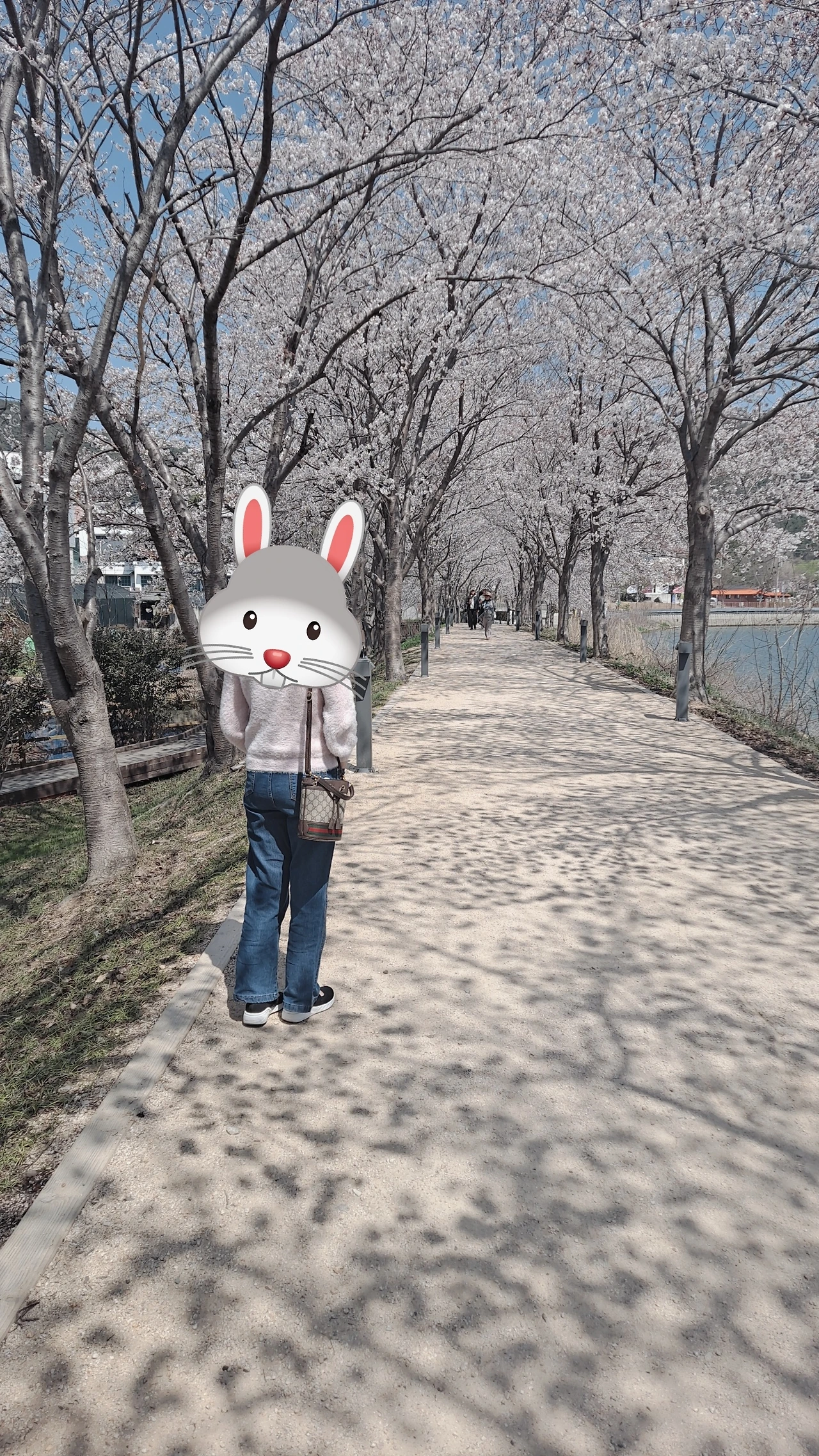 벚꽃과 같은 색깔의 옷을 입은 친구를 뒤에서 바라본다