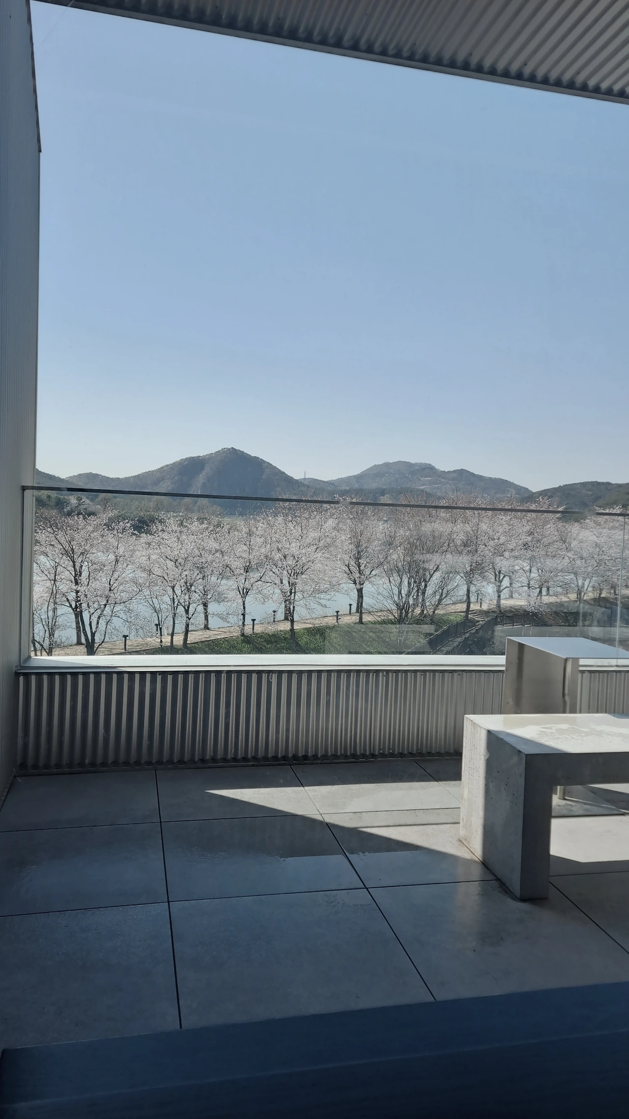 친구를 기다리며 창으로 보이는 벚꽃 터널은 만개해 예뻤다