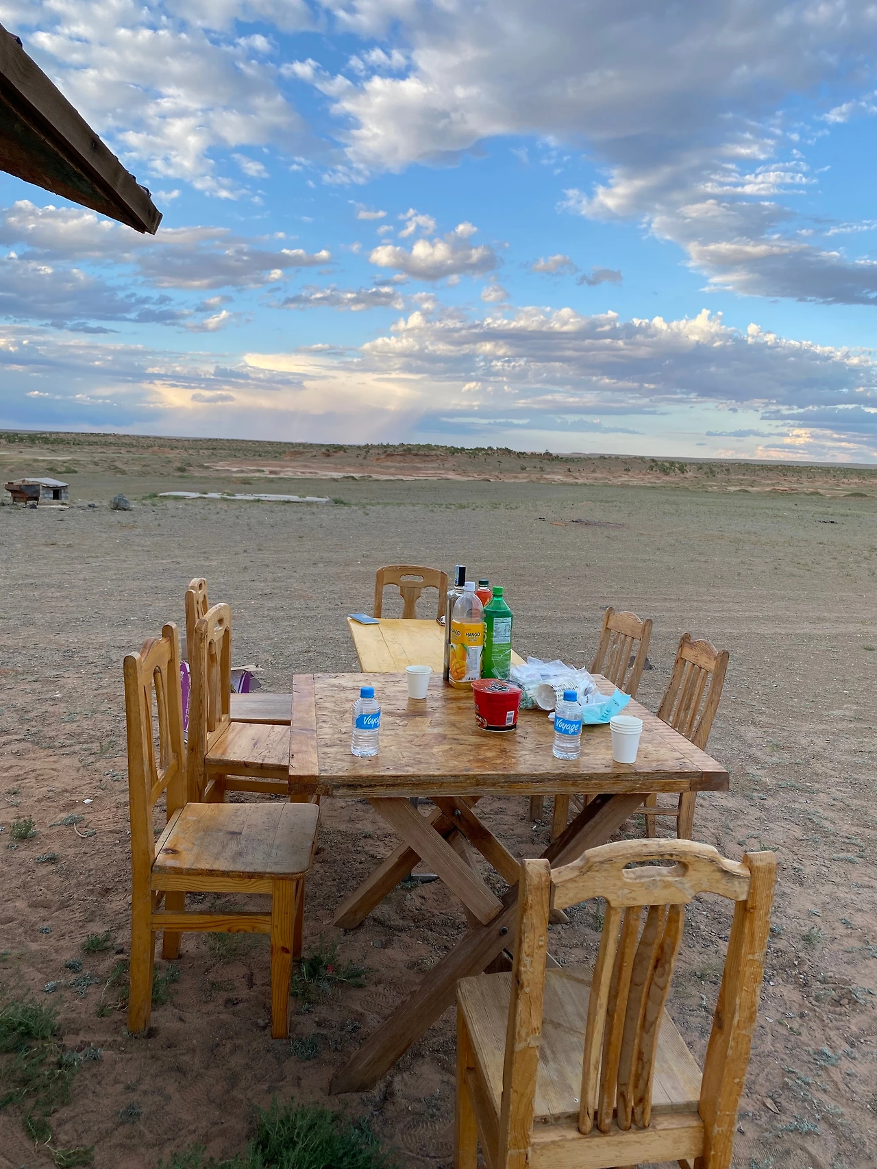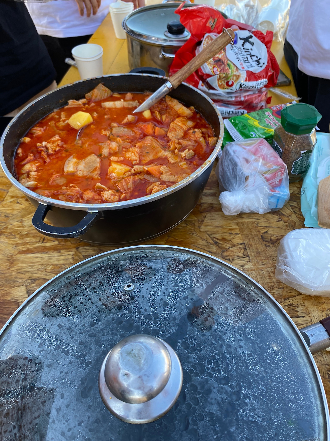 한 솥 가득 담긴 김치찌개 냄비를 들고, 게르에서 탈출했다. 창문 없는 게르는 너무 더워서 도저히 뭘 먹을 수 없었기에 야외 식사를 감행했다. 건물 뒤 작은 그늘에 테이블을 깔아놓고 식사준비를 시작했다.