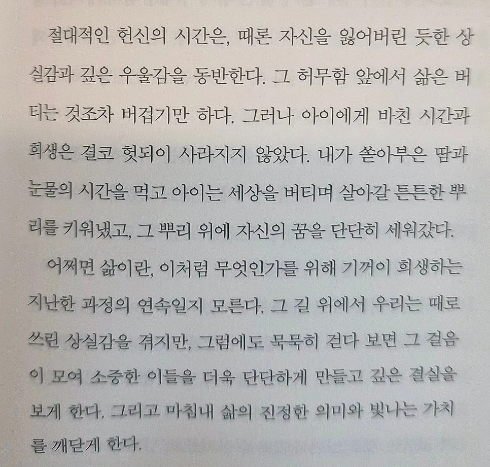 장애 아이를 키우는 엄마의 삶이었지만, 동시에 모든 엄마의 삶이기도 했습니다. 내 삶이기도 했고, 상담 장면에서 만나왔던 어머니들의 삶이기도 했습니다.