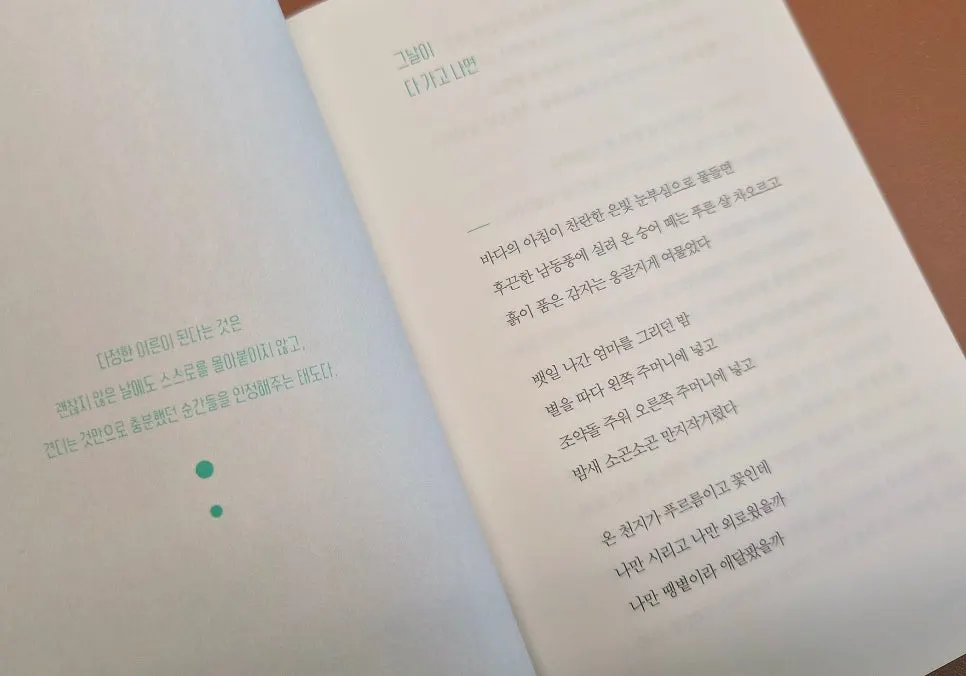 조금 보다 자야지, 했는데 어느새 마지막 페이지였습니다. 그리고 한참을 책 이곳저곳 다시 펴보며 읽기를 몇 번, 작가님과 헤어지는 것이 못내 아쉬웠습니다.