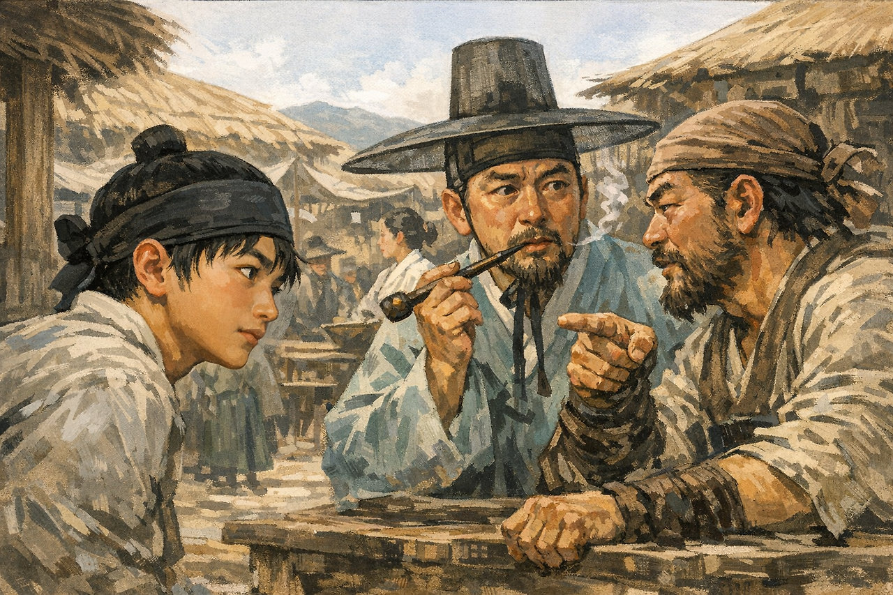 장터 난전 위로는 파리 떼가 윙윙거리고, 뜨거운 먼지 냄새가 코끝을 찔렀다.