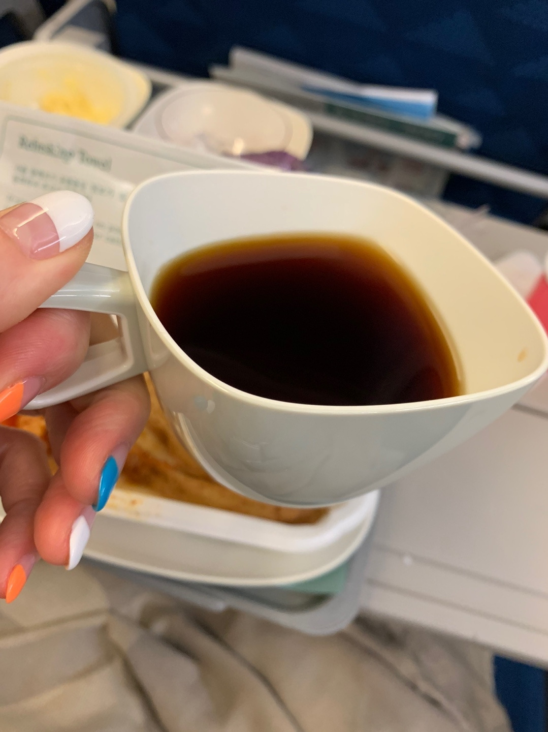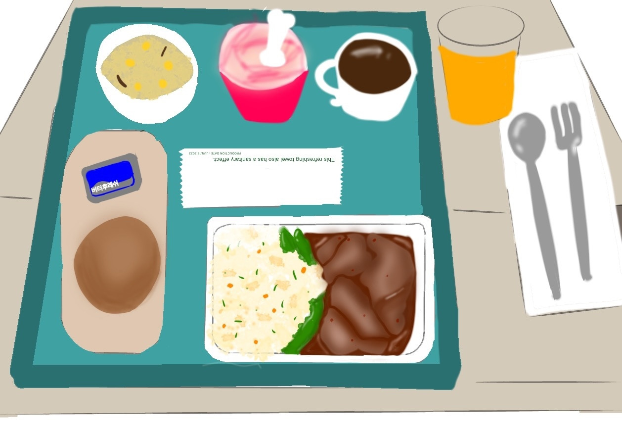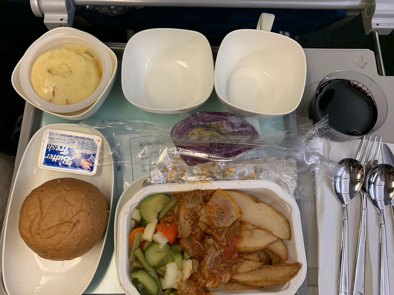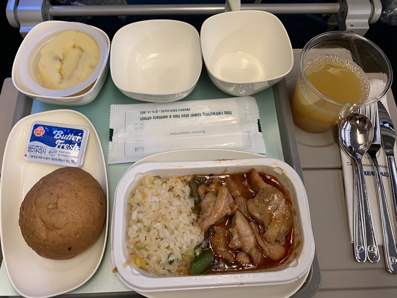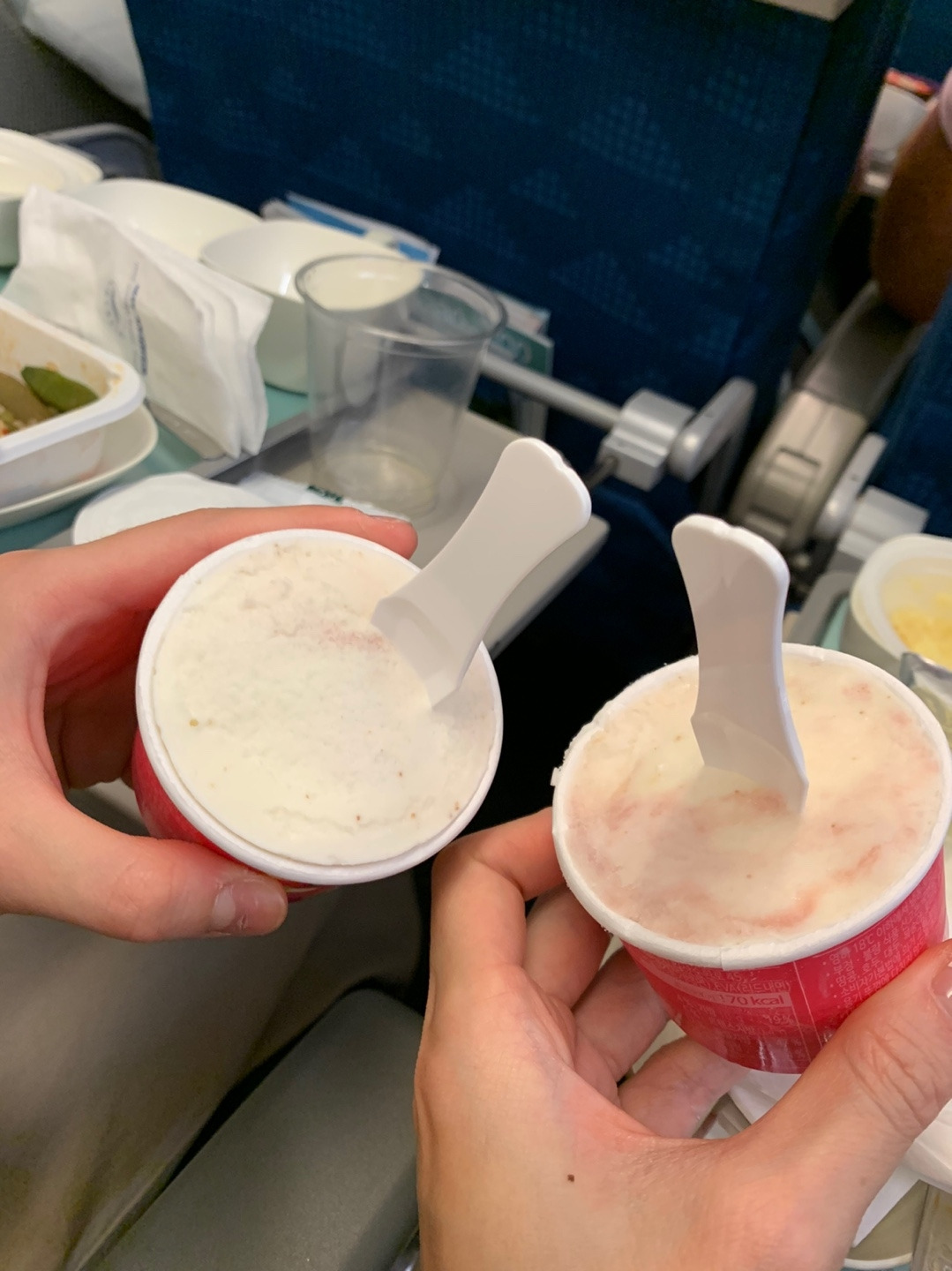 어느덧 시간이 흘러 비행기 탑승~그래도 미리 앞쪽 자리로 좌석을 지정해 놓아서 프레스티지 석이 크게 부럽진 않았다. 이륙 후 1시간 즘 후, 기내식이 나왔다. 선택지는 2가지. Beef with Potato, Chicken with Rice. 하나씩 시켜서 나눠먹기. 함께 나온 고구마 샐러드와 빵까지 야무지게 먹고, 후식으로 나온 아이스크림도 먹고, 나는 커피 한잔까지 마시고 나니 이번 출국을 앞두고 가장 기대했던 부분들 중 큰 부분은 벌써 모두 지나갔다는 생각이 들었다.