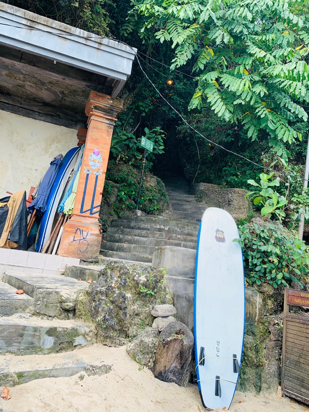⌜먹고 기도하고 사랑하라⌟라는 영화에 나와 유명해진 빠당빠당 비치. 입구에 내려 입장 티켓(인당 15,000 루피아)을 끊고 사람이 1명 정도만 지나갈 수 있는 아주 좁은 바위 사이의 나름 가파른 계단을 내려가다 보니 파도소리가 들려오기 시작했다. 사실 그 순간 아주 살짝 이 계단의 끝에서 내가 마주하게 될 풍경에 대한 기대를 해보았다.