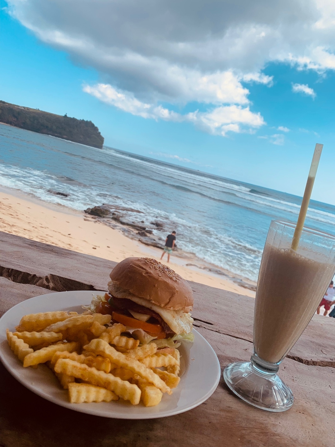 그리고 썬베드를 빌려 모닝 빈땅도 먹고 책도 읽고 외국인들도 실컷 구경했다. 점심을 꼭 먹어야 해서가 아니라 솔직히 화장실을 가고 싶어 한국 엄마들이 불결하다며 질색할 것 같은 비치카페에 들어가 자리를 잡았다. 바나나 셰이크와 발랑안 버거를 시켜 먹고 또 한참을 앉아서 서양인들을 구경했다.