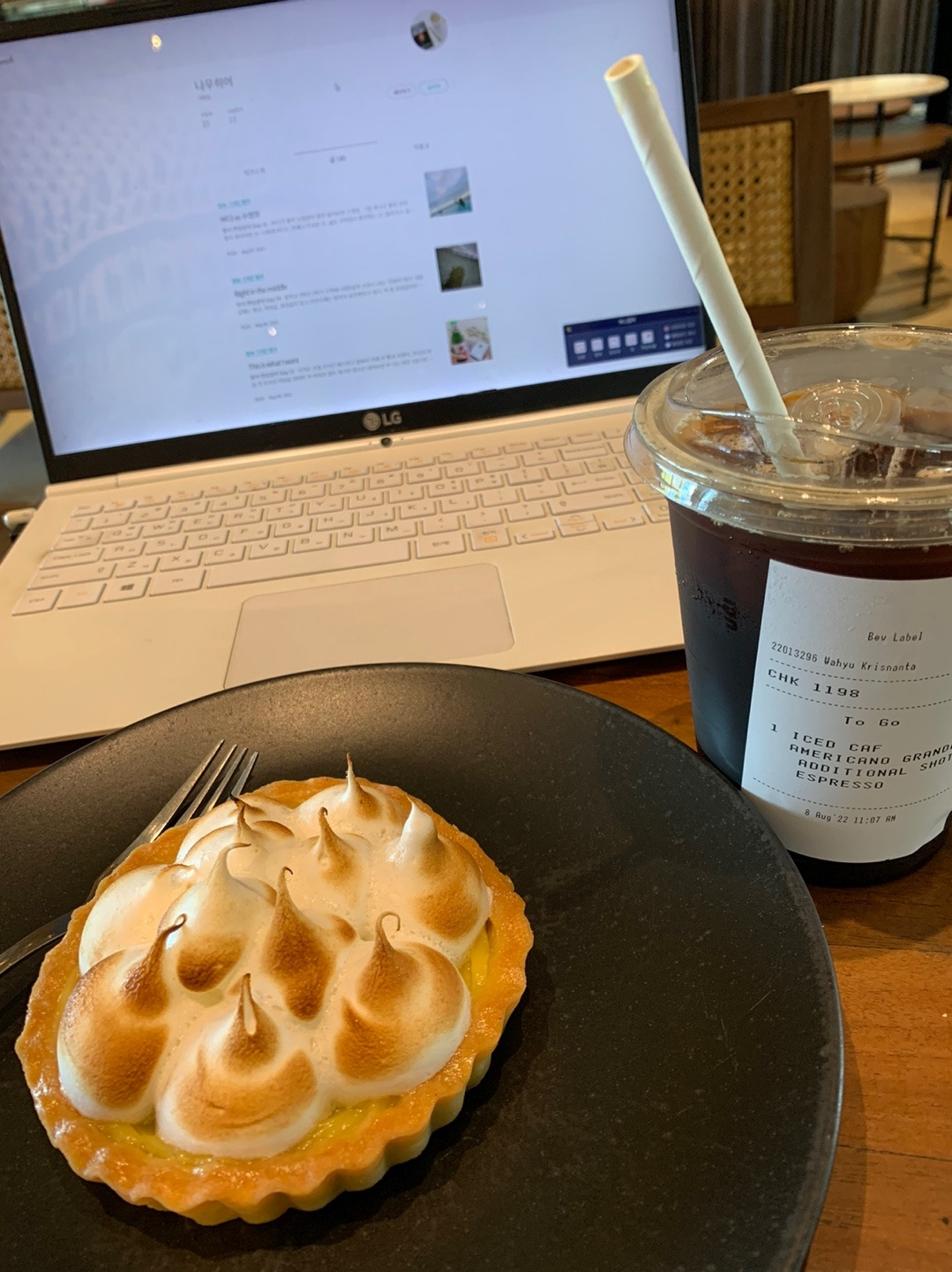 아무튼 그래서 오늘은 인공과 자연을 적절히 섞은 믹스 앤 매치의 하루를 보내기로 했다. 자연을 제대로 느낀 요가 수업이 끝나자마자 옷만 갈아입고 택시를 불러 스미냑에 있는 아시아 최대 규모라는 스타벅스로 향했다. 11:30 즘 도착해서인지 아직 사람이 적어 1층과 2층을 오가며 사진을 찍고, 한국에서는 거의 시킬 일이 없는(시킬 수도 없는) 레몬 타르트와 아아를 시켜놓고 오늘 다 읽은 책의 구절을 블로그에 올리고 나니 어느새 사람들이 북적북적 좀 시끄럽다는 생각이 들었다.