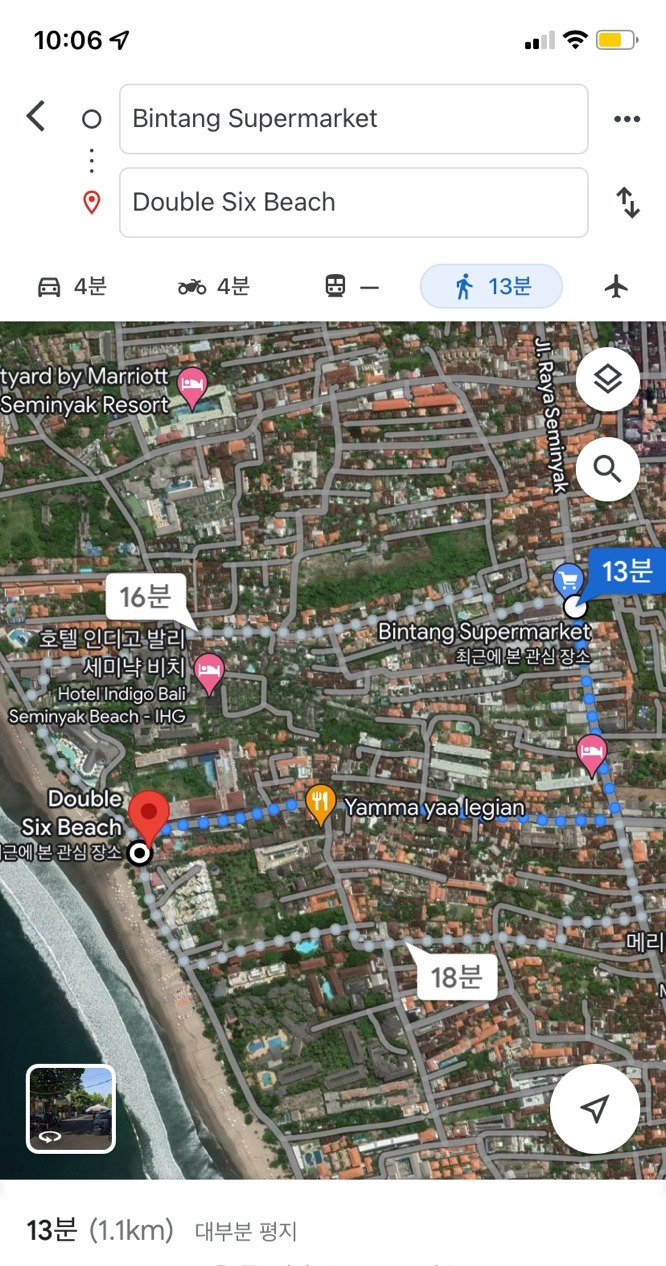 다음 행선지는 다시 광활한 자연의 품으로. 한낮의 스미냑 거리를 걸어 걸어 더블식스 비치라는 곳으로 가보기로 했다. 나는 원래 길치, 방향치라 운전할 때도 무조건 네비에 의존하고 모르는 길을 혹시 걸어갈 때도 지도 앱을 켠 채로 가라는 길로만 간다. 한국에서는 거의 네이버 지도 앱을 애용하지만 여기는 외국이니까 구글맵을 켜고 빈땅 슈퍼마켓에서 더블식스 비치까지 경로를 검색해보니 거리는 약 1.1km. 못 걸을 거리는 아니었다.