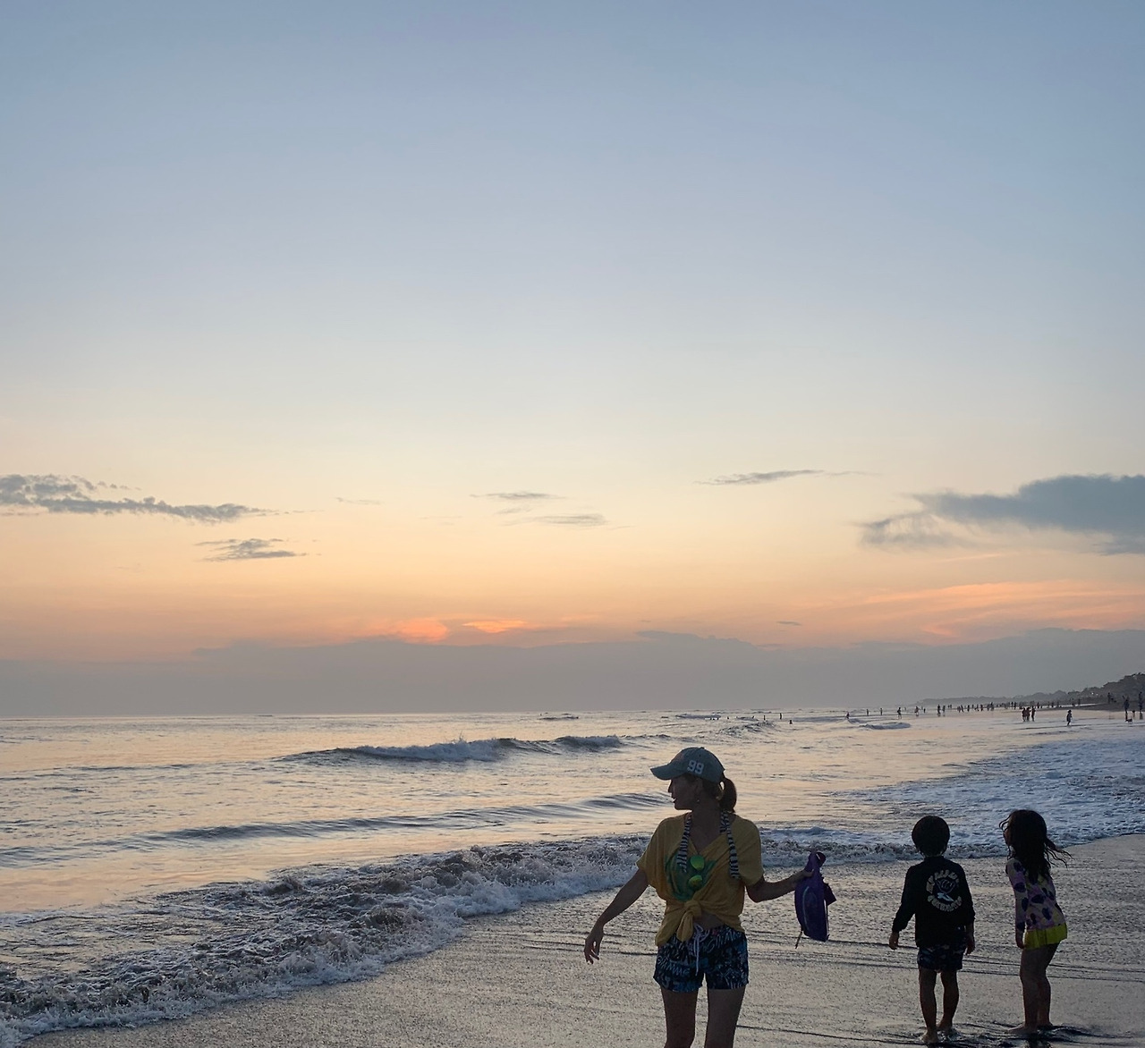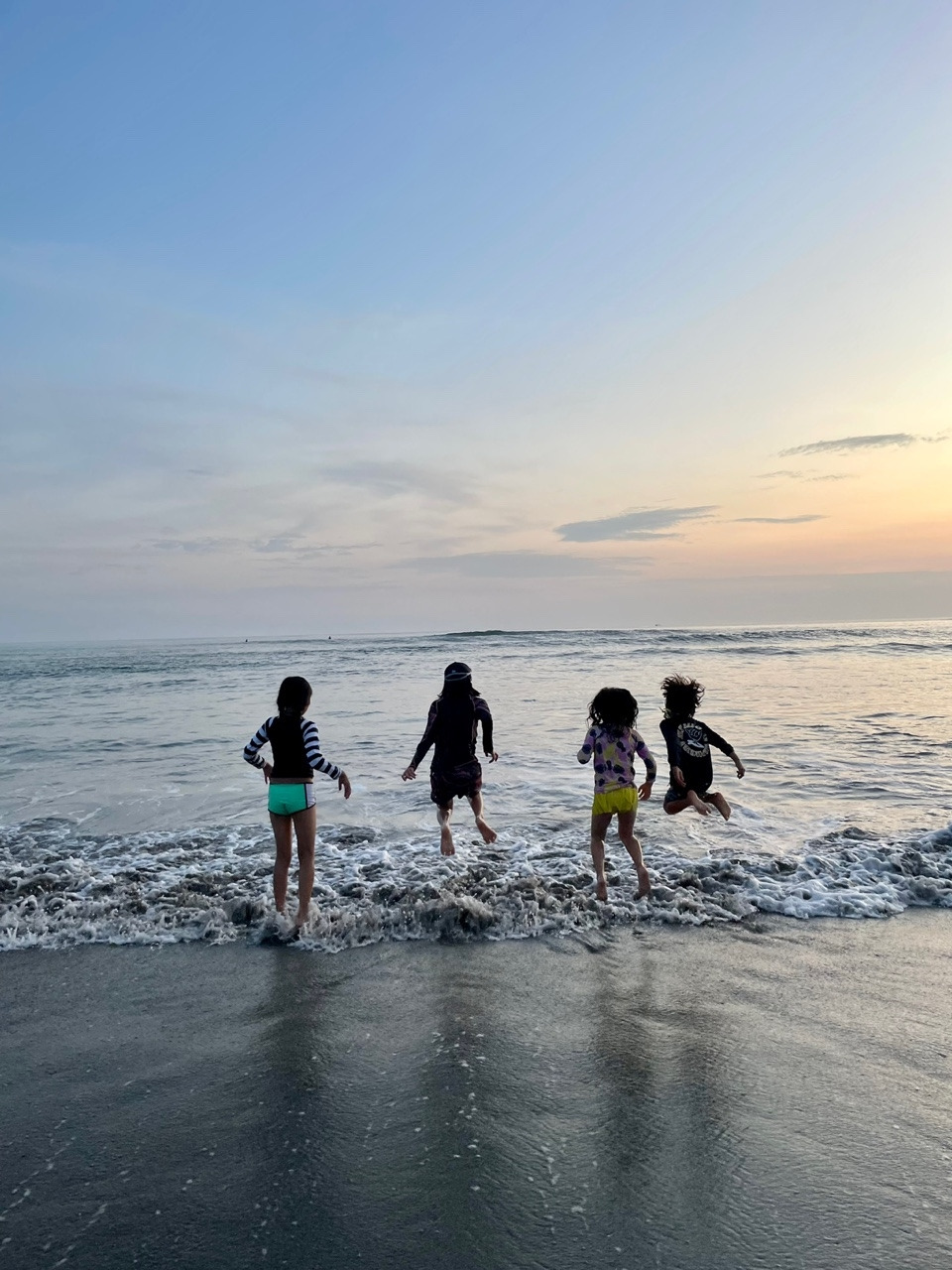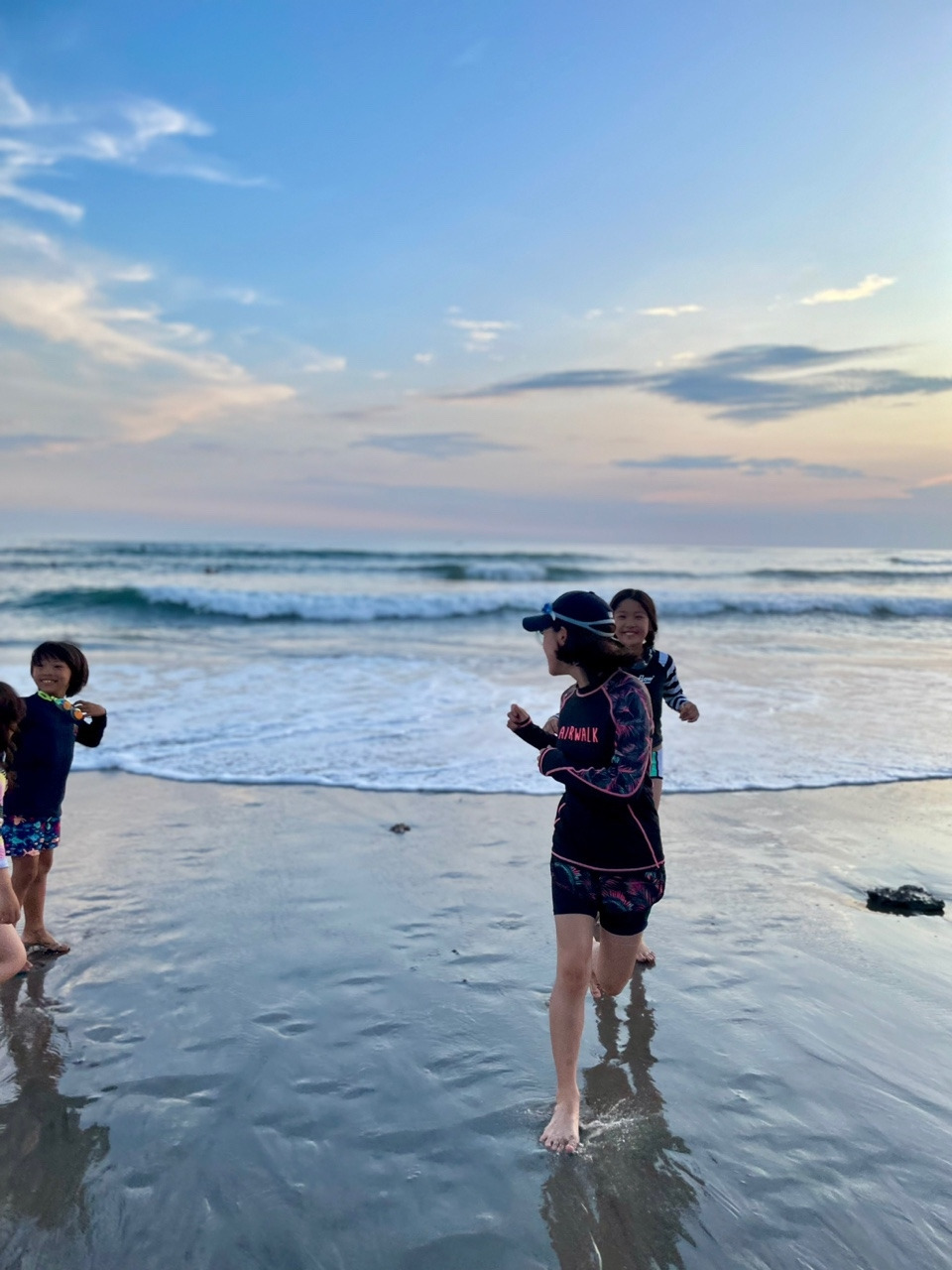 오늘 함께한 아이들은 초5 2명, 초2 1명, 초1 1명, 총 4명이어서 역시나 자기들끼리 키즈풀과 일반 풀을 오고 가며 슬라이드도 타고 튜브도 서로 태워주고 끌어주며 중간중간 엄마들에게 와서 간식도 얻어먹으며 잘 놀았다. 푸드코트에서 간단히 저녁을 먹은 후 노을이 지는 바다로 가보았다. 그동안 갔던 해변보다 약간 색이 검은 모래도 생각보다 차갑지 않은 바닷물도 다 좋았다.