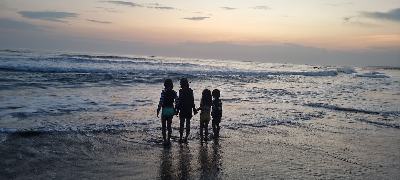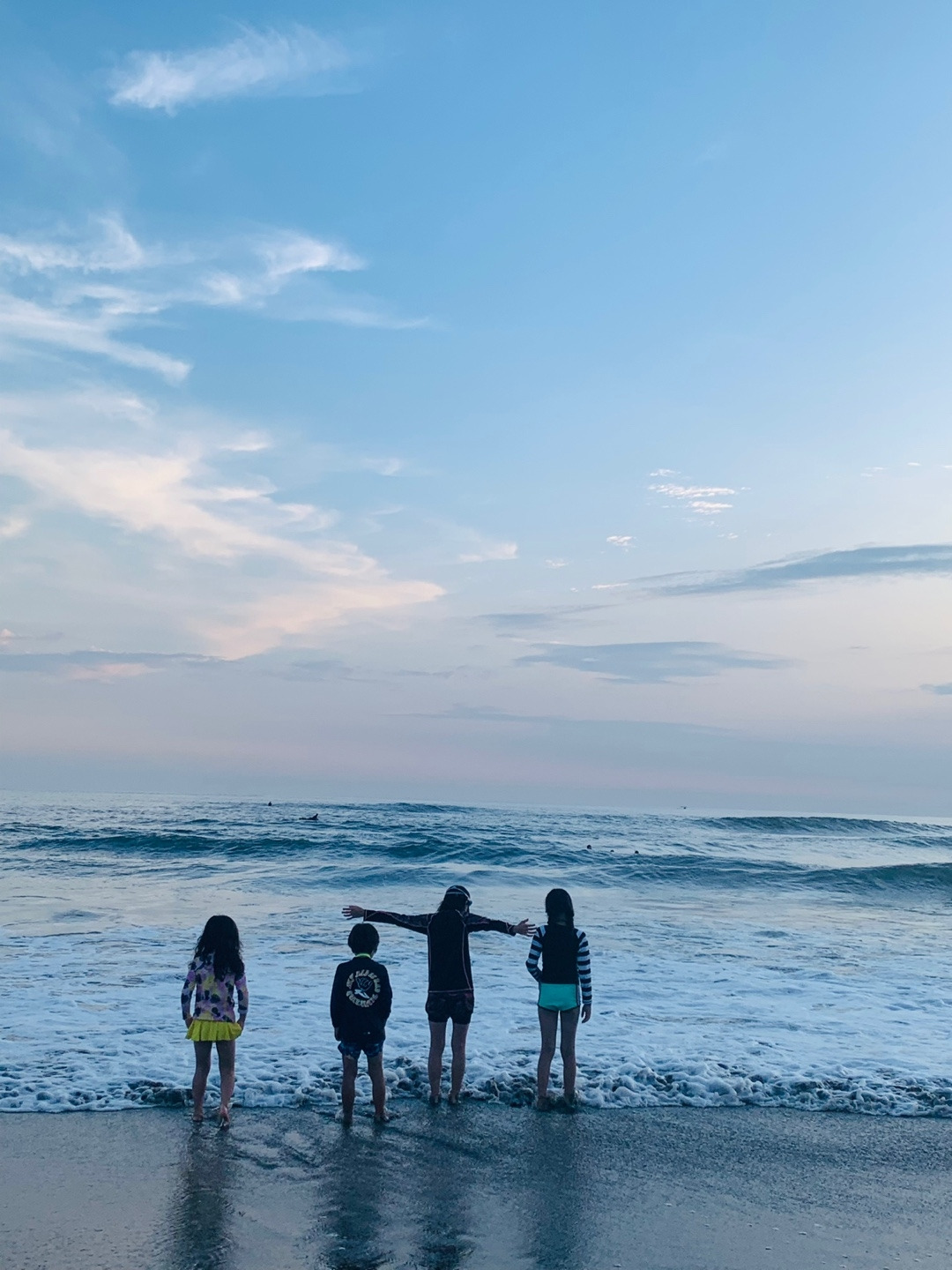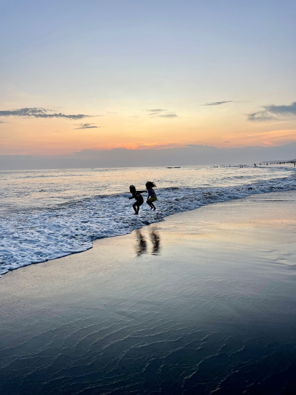 오늘 함께한 아이들은 초5 2명, 초2 1명, 초1 1명, 총 4명이어서 역시나 자기들끼리 키즈풀과 일반 풀을 오고 가며 슬라이드도 타고 튜브도 서로 태워주고 끌어주며 중간중간 엄마들에게 와서 간식도 얻어먹으며 잘 놀았다. 푸드코트에서 간단히 저녁을 먹은 후 노을이 지는 바다로 가보았다. 그동안 갔던 해변보다 약간 색이 검은 모래도 생각보다 차갑지 않은 바닷물도 다 좋았다.
