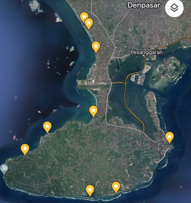제일 위에서부터 시계 반대 방향으로 스미냑 비치, 더블식스 비치, 꾸따 비치, 짐바란 비치, 발랑안 비치, 빠당빠당 비치, 멜라스티 비치, 판다와 비치, 누사두아 비치이다. 이 중 제일 많은 시간을 보낸 곳은 아마도 꾸따와 짐바란, 그리고 누사두아일 것이다.