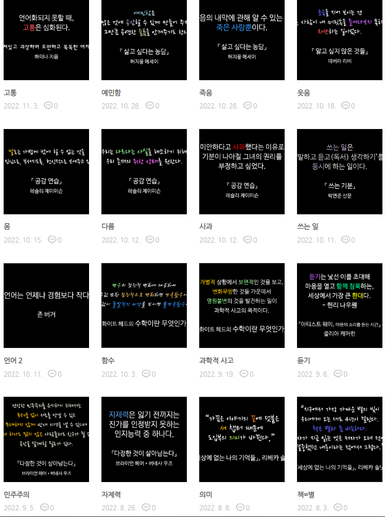이것을 시작한 이유는 내가 읽었던 책에 대한 기억을 남겨두고 싶어서 그리고 언젠가 나만의 글을 쓸 때 그 기억들을 조금 더 쉽게 끄집어낼 수 있지 않을까 해서였다. 실제로 브런치에 올릴 글을 쓸 때 블로그를 뒤적뒤적하는 경우가 많으니까 처음의 이유를 잘 활용하고 있는 셈이다. 이제 나는 책을 다 읽었다는 것이 책의 마지막 글자를 읽고 책을 덮는 것이 아니라 책 귀퉁이를 접었던 페이지들에서 나를 흔들었던 문장들을 다시 읽으면서 타이핑을 하고 그것을 모아 블로그에 책 표지와 함께 올리는 것이 되어버렸다. 이 루틴도 앞으로 계속 이어나갈 것.