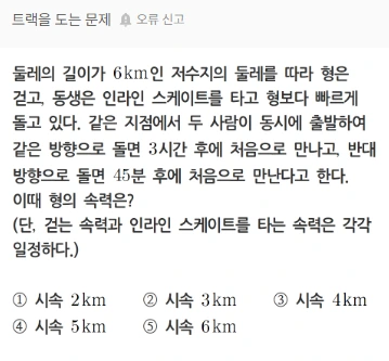 그 뒤로도 나는 계속 한 바퀴 뛰고 한 바퀴 걷고를 반복하는 동안 그 사람은 역시 젊은이라 그런지 내가 보기에 4바퀴 아니면 3바퀴 정도를 연속으로 뛰는 것 같았다. 그런 상황이 올 때면 나는 항상 중학교 2학년 수학 문제 중 속력이 다른 두 사람이 트랙을 같은(또는 반대) 방향으로 돌 때 같은 지점에서 동시에 출발한 후 처음으로 다시 만나는 것은 출발한 지 몇 분 후인지를 묻는 문제를 떠올린다. 오늘 그 사람과 나는 같은 방향으로 돌았고 속력이 달랐기에 중간에 두어 번 만났던 거 같다.