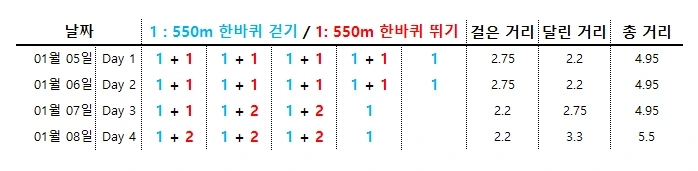 첫날과 둘째 날은 같은 패턴으로 일종의 몸풀기를 했다면, 셋째 날 걷는 양을 줄이고 뛰는 양을 늘려보았다. 그리고 오늘은 무려 2바퀴 연속 뛰기에 도전. 그리고 뛰는 양을 조금 더 늘리기. 천천히 달리기는 했지만 2바퀴 연속도 아주 무리한 것은 아니었다. 조만간 빨간색 숫자 3이 등장할 것 같고, 우선 1월 달 안에 빨간색 숫자 5를 찍어보는 것이 목표이다.