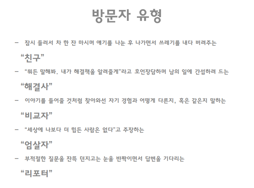 최초에 10명의 암환자들을 컨택하면 그중에 3~4명이 프로젝트 참여에 힘겹게 동의를 해주었고, 동의를 했다고 하더라도 “사전 설문지 작성 - 일정한 주기마다 타액을 3회 모으기 - 사후 설문지 작성”이라는 과정을 모두 수행하는 사람은 2명 정도였다. 그만큼 참여자 자체를 확보하고 그들에게 우리가 원하는 바를 끝까지 얻어내기가 어려운 프로젝트였다. 하지만 힘들수록 교수님은 우리들을 더 채찍질했고, 우리들은 아니 나는 기계적으로 그 과정을 수행했다. 심지어 학생들 사이에서 환자들을 잘 설득해 동의를 구하는 확률이 높은 사람을 약간 인정하는 분위기도 있었다. 그래서 2인 1조로 병실에 갈 때, 설득의 달인과 보조자가 짝을 이루어 가곤 했었다. 그 당시 우리들은 위의 방문자 유형 중 딱, “리포터”들이었다.