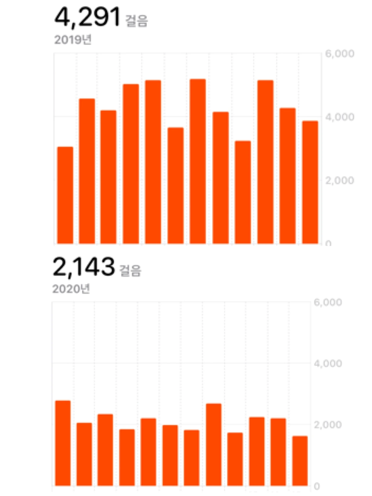 먼저 운동. 2019년에 나는 일평균 4,291 걸음을 걸었는데, 올해는 2,143 걸음을 걸었다. 5걸음은 오차범위에 들어간다 치면 딱 반토막이 난 셈이다.