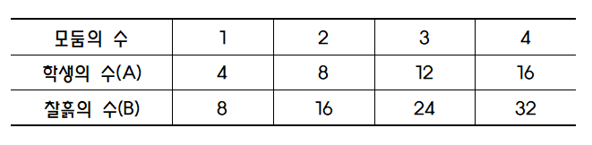 뺄셈으로 비교하는 것과 나눗셈으로 비교하는 것. 예를 들어 다음과 같은 표가 주어지고 학생의 수(A)와 찰흙의 수(B)를 비교하는 표현을 할 때, 뺄셈으로 비교하면 모둠의 수에 따라 A와 B의 관계가 변하지만 나눗셈(또는 곱셈)으로 비교하면 A와 B의 관계는 변하지 않는다. (B-A의 값은 모둠의 수에 따라 4, 8, 12, 16으로 변하지만 B/A의 값은 항상 2이다.)