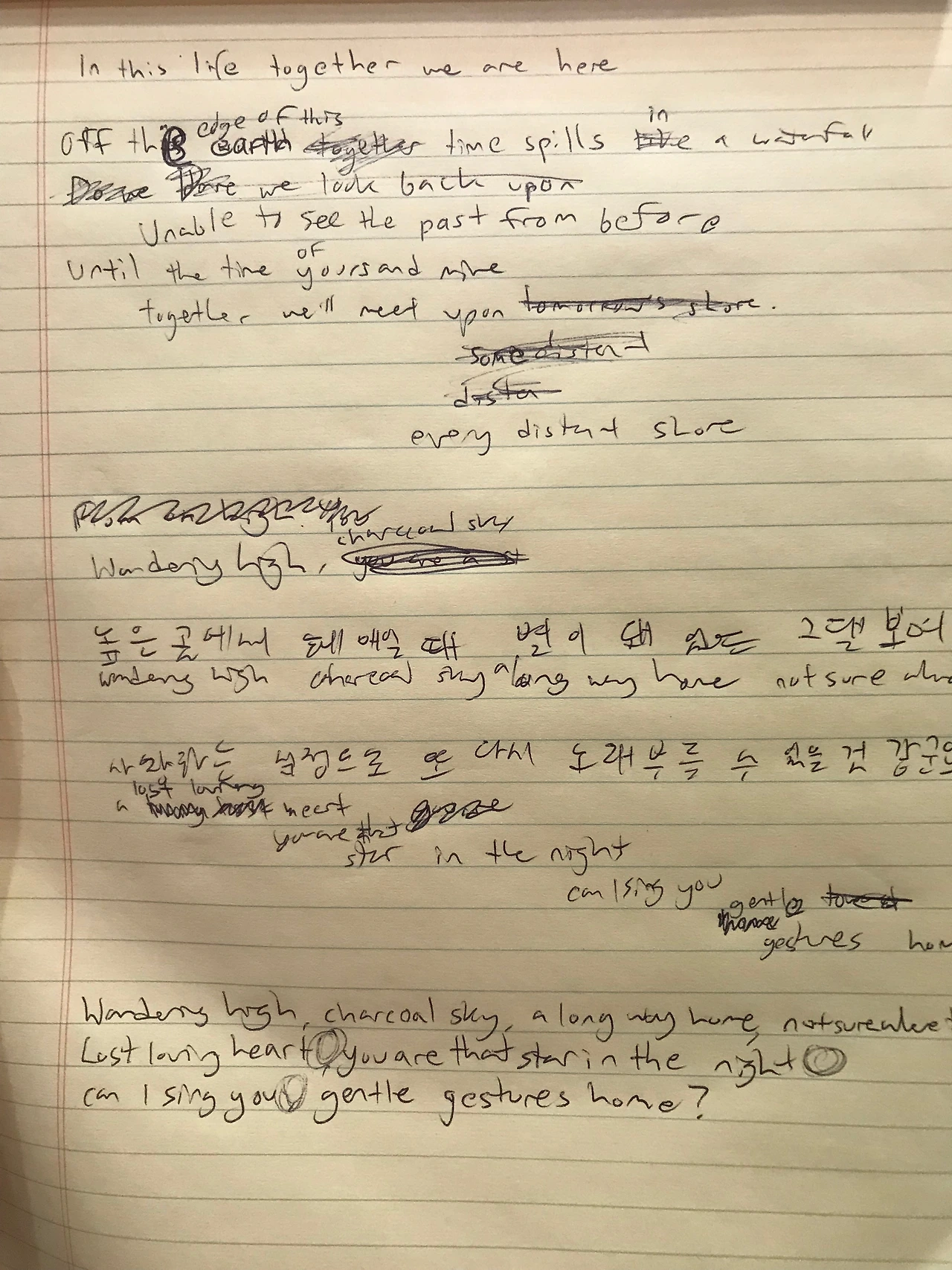 작업 당일 녹음실에서 즉흥적으로 영어 가사를 써보자고 제안했다. 곧바로 적은 문장들이 놀라울 정도로 아름다웠고, 영어를 잘하는 것도 아닌데 작업하는 동안 언어의 장벽 같은 게 느껴지지 않았다. 지금까지도 신묘하게 남아있는 기억이다.