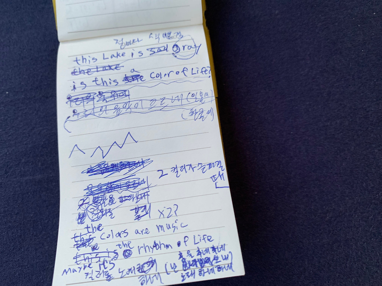 2집 [터무니없는 스텝]을 발매하고, 2020년 11월 입대했습니다. 훈련소에는 악기도 없고 녹음기도 없었습니다만, 기존에 코드 4개를 반복해서 만든 'The Lake'라는 곡이 자주 떠올랐기 때문에 떠오르는 멜로디와 아이디어를 기록할 수 있었습니다. 악보도 쓸 줄을 모르다 보니 멜로디도 선을 그어 기록했습니다. 이 곡의 후렴과 관련한 비하인드 스토리.