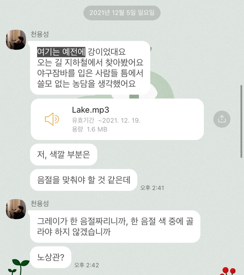 2021년 12월 05일, 용성이 곡을 보내주셨습니다. 정말 그 다운 곡이라고 생각했습니다. 그가 작곡할 때 구사하는 한국말엔 당연한 소리밖에 없는데, 그게 상당히 역사적이고 함축적이어서 마법처럼 많은 걸 소환해요. 품이 넓은 작사가인 것 같아요.
