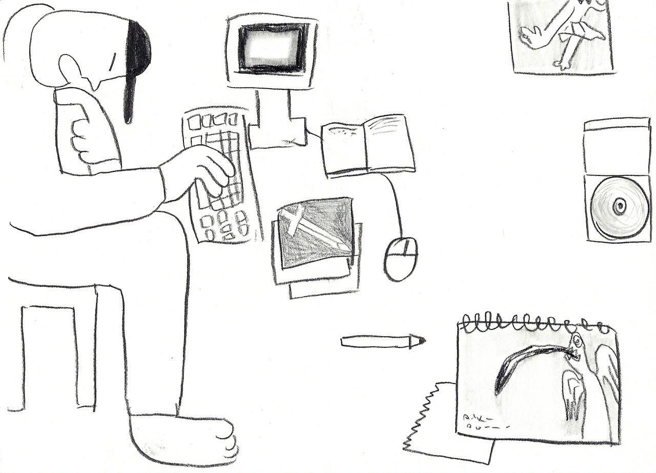 그의 그림은 '못잘그렸다'라고 농담조로 얘기하다가, 그것이 굳어져 초기엔 음악 제목을 '못잘그린그림체'로 상정하고 작업했습니다. 이후에 [창작자의 방]으로 변경된 이유가 있는데, 이려진 작가님이 업로드한 그림을 보고 완전 놀라서 이걸 메인 아트웍으로 써야겠다는 생각을 했기 때문입니다. 그 그림의 제목이 '창작자의 방'이었고, 그 그림과 제목이 이 음반을 제작하는 저의 방식과 환경을 설명하기에 더할나위 없다고 생각하여 음반의 제목으로까지 차용한 것입니다. 서로 무의식의 단위로 미세한 시너지를 발휘한 것 아닐까 생각이 드는 건 저만 그런가요. 이려진 작가님은 컴퓨터로 작업하는 사람도 아니고, 시디 매체를 다루는 사람도 아닌데... 진짜 이상한 경험.