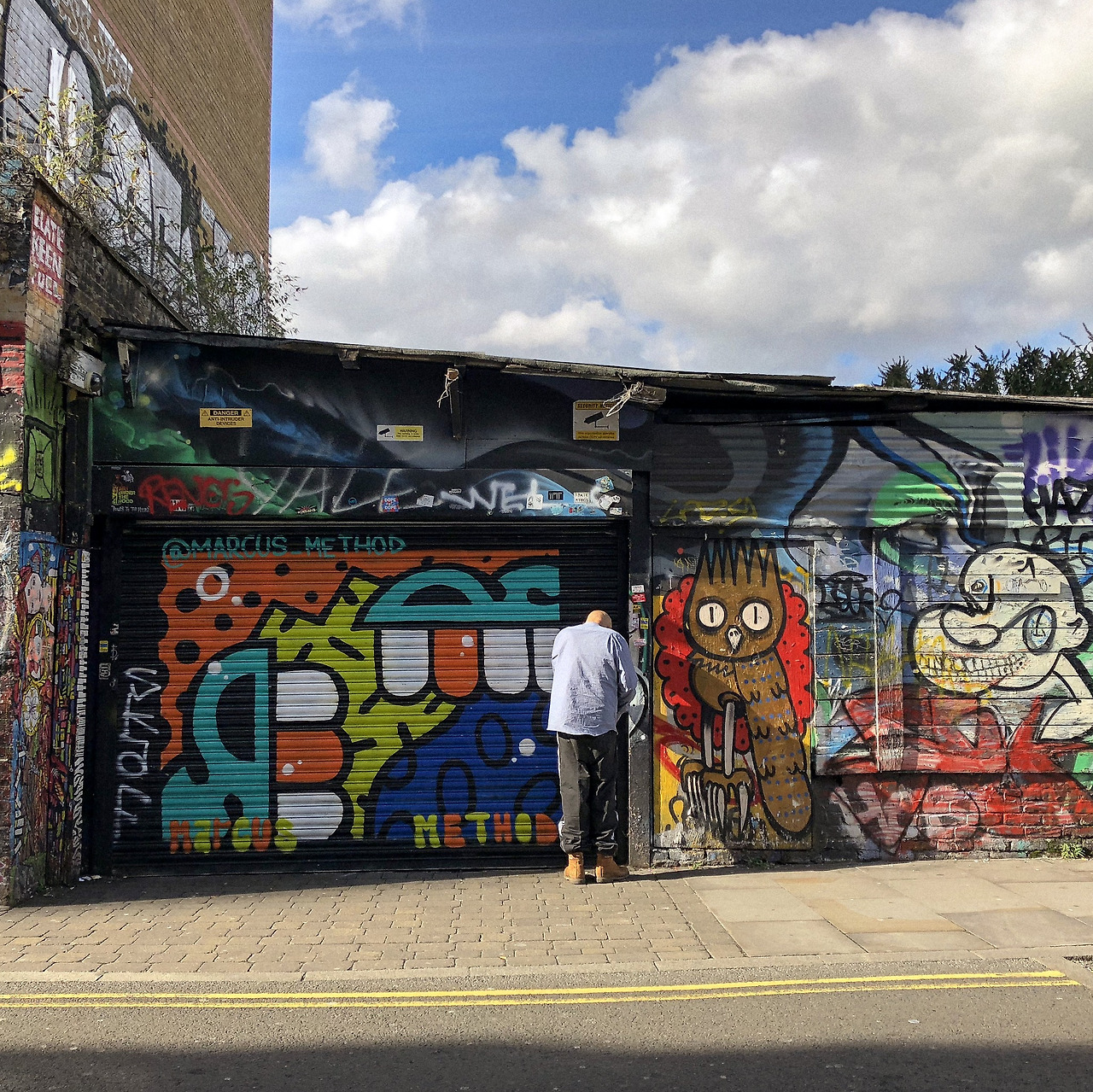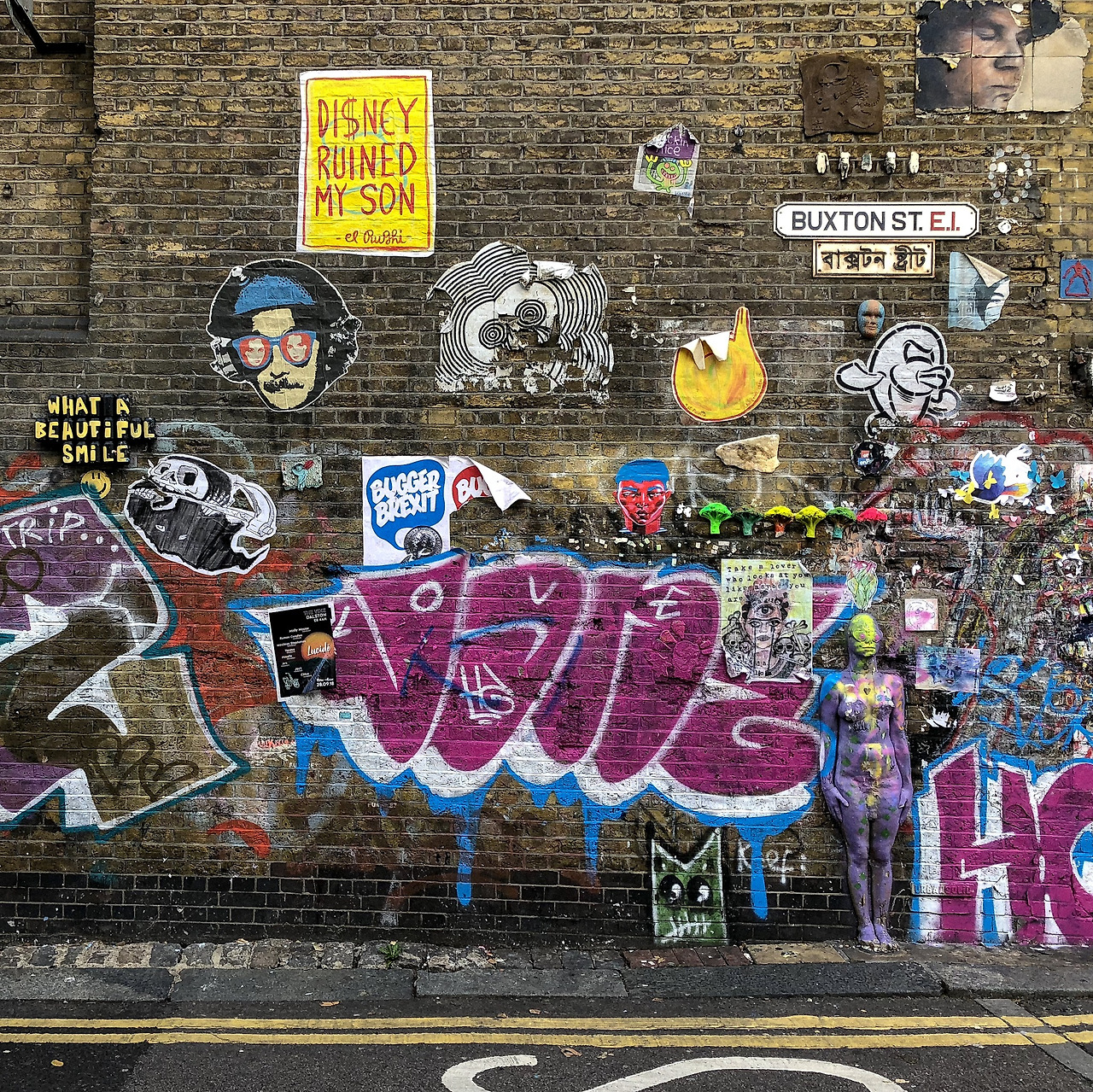 브릭레인을 쭉 따라 걷는데 양쪽으로 화려한 그라피티가 끊임없이 펼쳐져 있어 눈이 즐거웠다. 오히려 아침에 봤던 쇼디치-해크니쪽 보다 더 힙하다. 그쪽이 계획적으로 예쁘게 그린 그림 같다면, 이쪽은 예술가들이 자기가 전하고 싶은 메시지를 몰래 표현하고 도망간 낙서장 같다.