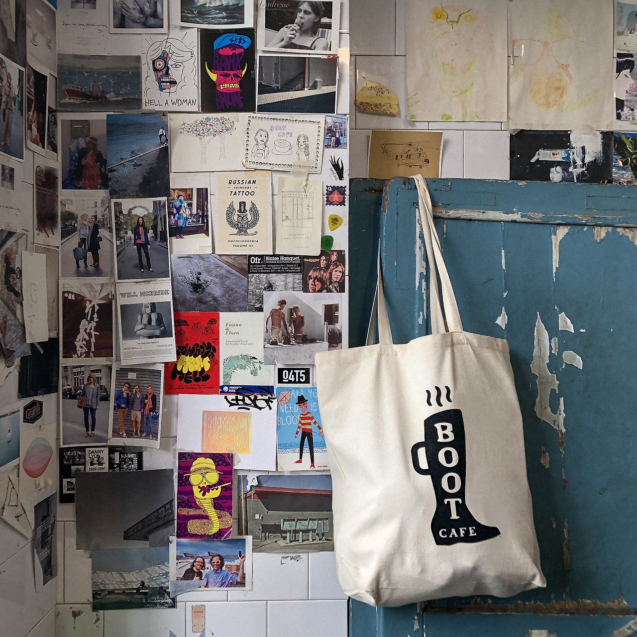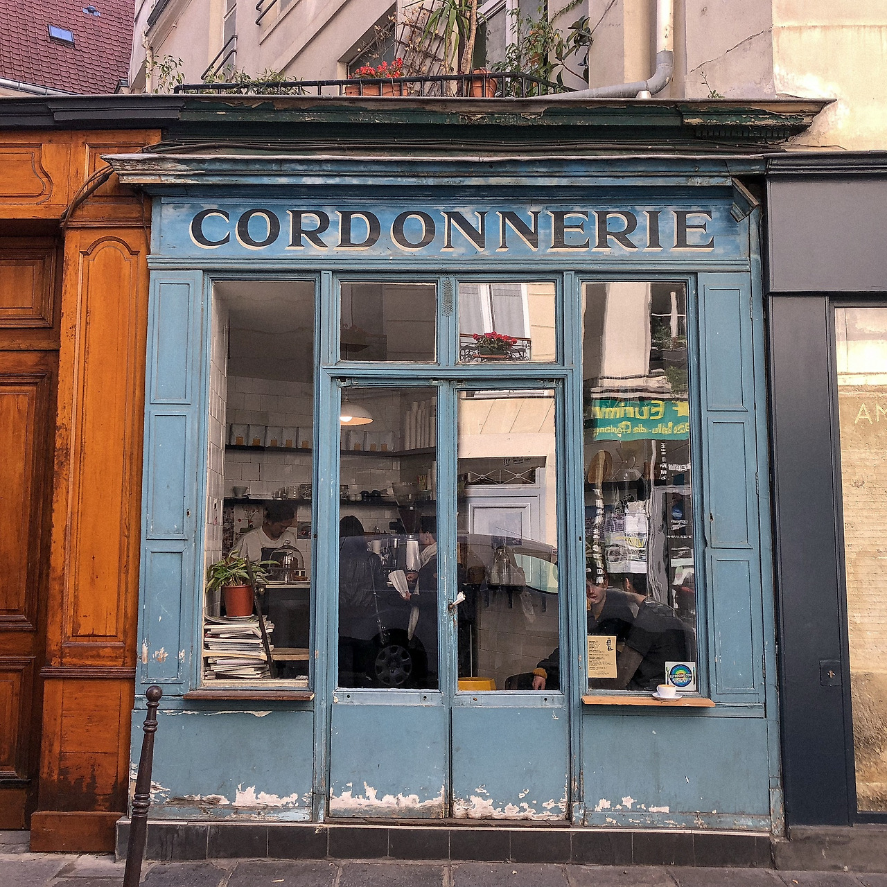 우리에게 송흥을 영업했던 언니들의 카페 픽 'Boot Cafe'도 바로 가봤다. SNS 인물 사진이나 잡지 화보의 배경으로 이미 수십 번은 본 듯한 이 파란 외관. 카페 간판 대신, 구두 수선소를 뜻하는 'Cordonnerie' 간판이 여전히 걸려있다.