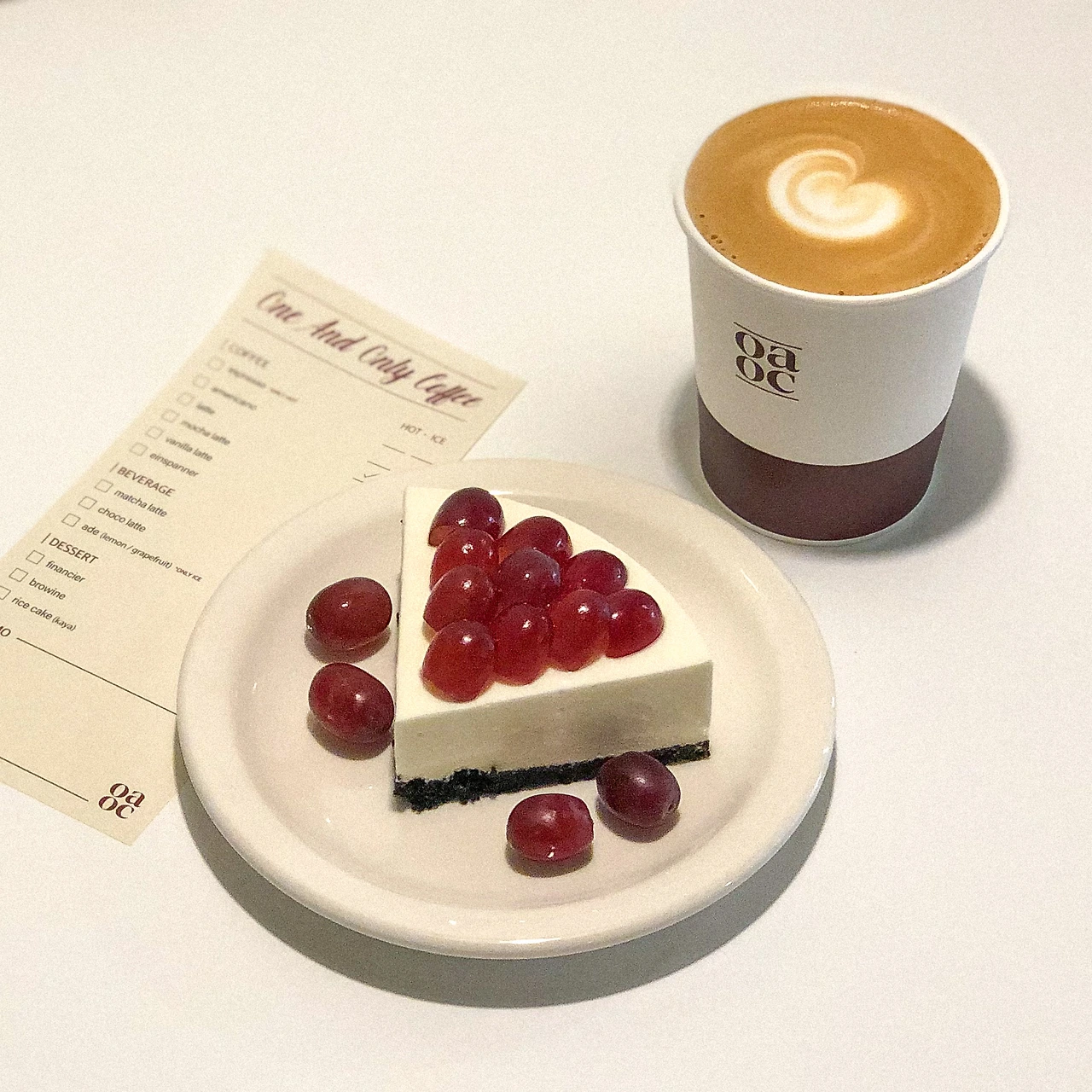 여기 레어 치즈 케이크가 찐으로 맛있었다. 이게 크림인지 치즈인지 케이크인지 모를 정도로 입에서 그냥 사르르 녹아 버린다. 빨간 포도가 토핑으로 올라가 있어서 종이컵과 영수증 종이와 컬러도 찰떡이라 예쁘다. 외관도 인테리어도 음식도 다 너무 예뻐서 계속 사진 찍고 싶어 지는, 인스타그래머블한 카페였다.