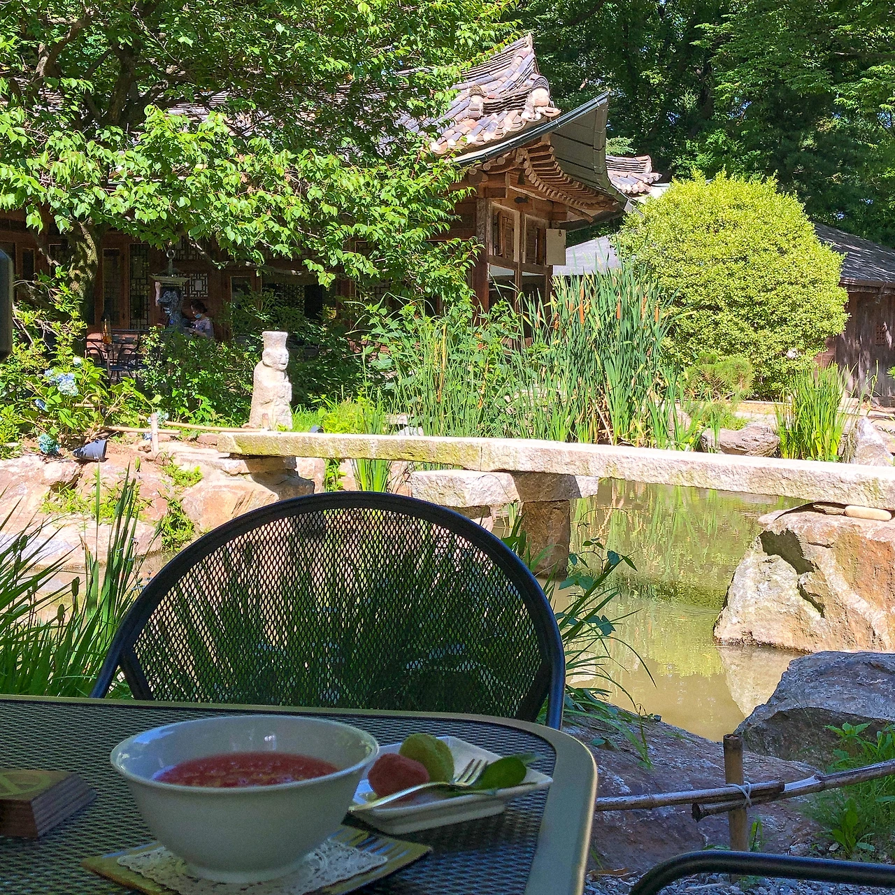 퇴근길에 잠깐 들렀을 뿐인데 어디 멀리 여행 온 듯한 기분을 낼 수 있는 곳. 여기 산속까지 버스 타고 걸어 올라온 손님은 나뿐인 것 같지만 충분히 차 없이도 올 만 했다. 100년이 넘었다는 반듯한 한옥 건물을 개조한 찻집으로, 앞마당에는 잉어가 사는 연못과 돌다리가 있고 곳곳에 큰 나무와 꽃들이 많아서 한적한 자연 속 느낌도 물씬 풍긴다. 실내에는 웨이팅이 있어 야외 마당 테이블에 자리를 잡고 앉았다. 시원한 바람이 불어 괜찮았다.