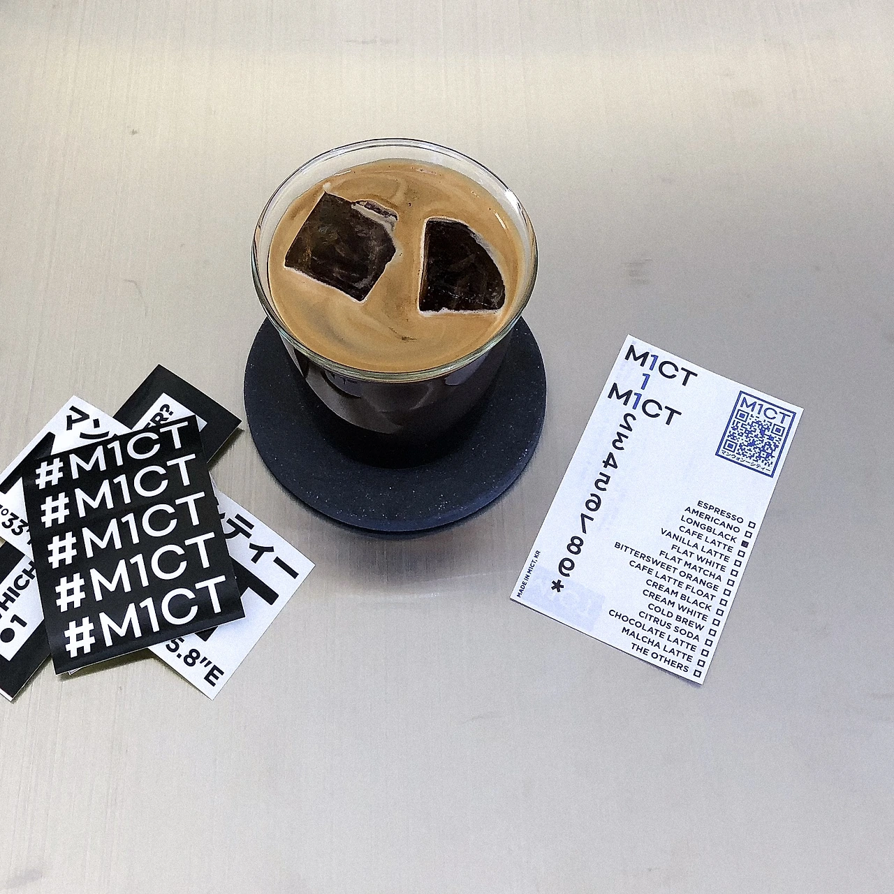 커피와 함께 주는 주문서(?) 영수증과, 블랙 앤 화이트 스티커를 챙겨 왔다. M1CT의 힙함을 제대로 보여주는 종이 쪼가리들, 너무 좋다.