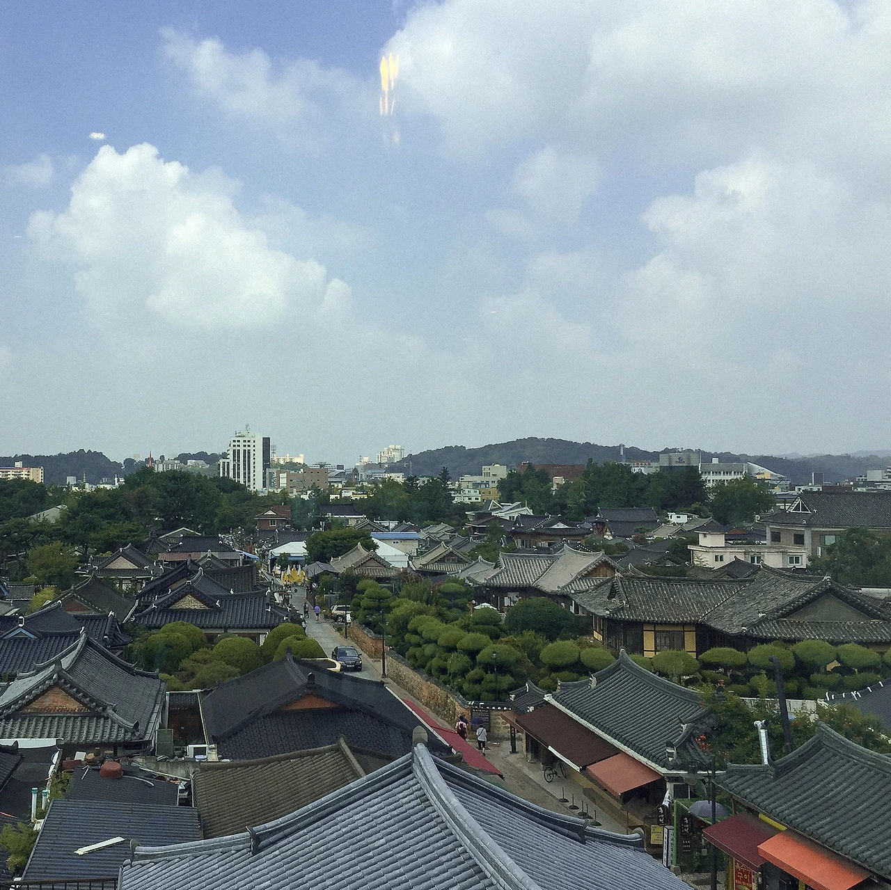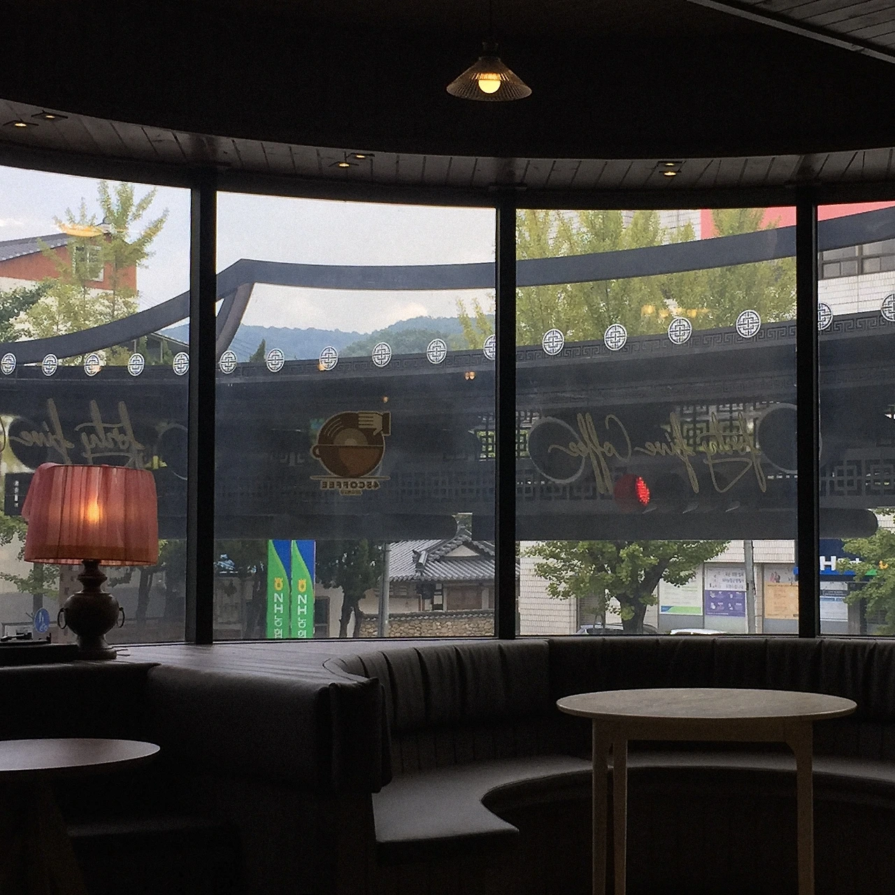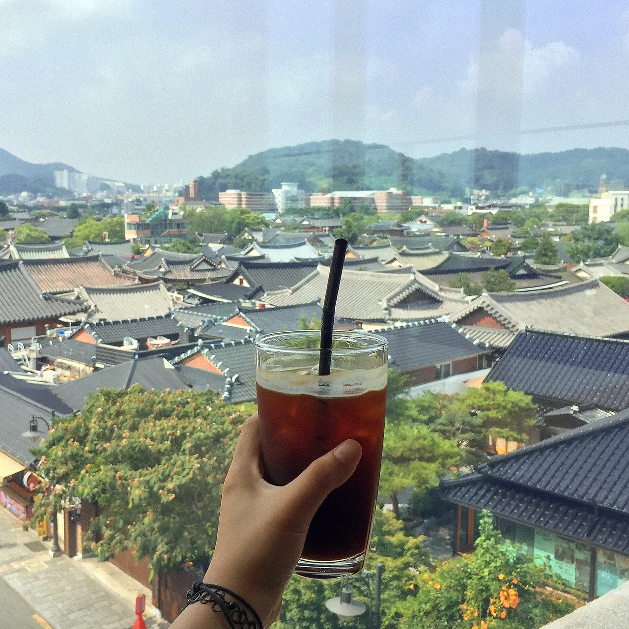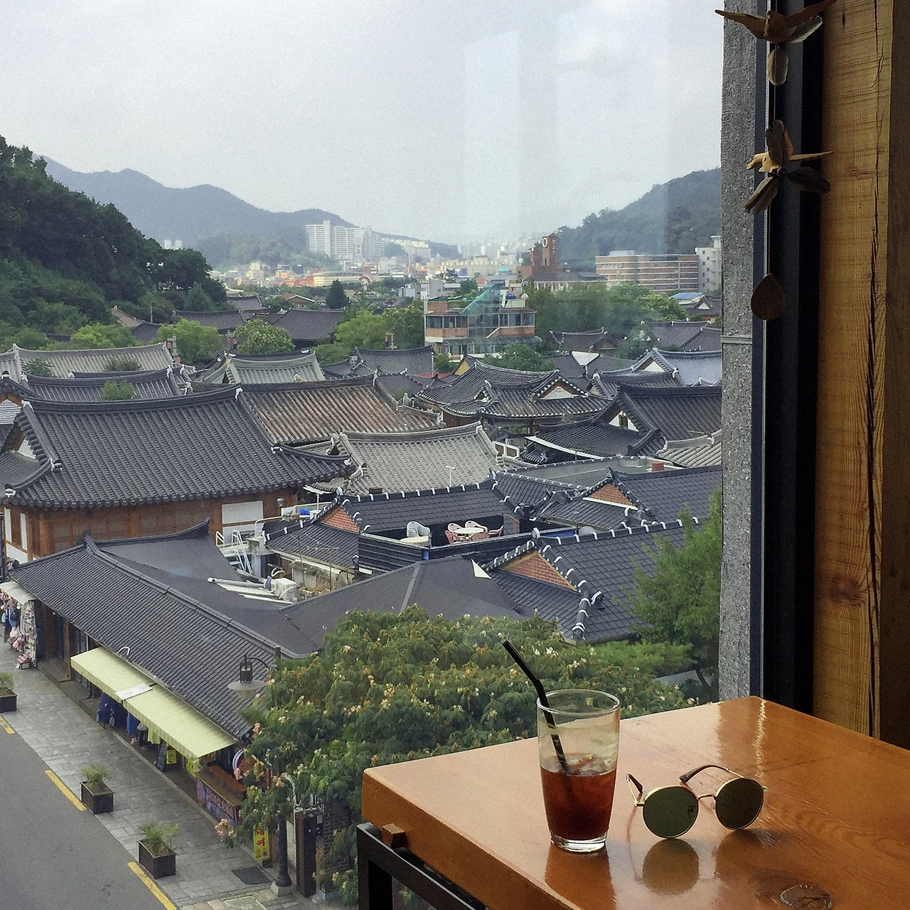 말 그대로 '이름값' 하는 곳. 전주 한옥마을 전경을 내려다볼 수 있는 전망 카페다. 5층밖에 안 되는데 뭐가 보이긴 할까 싶었지만 여기는 도심 속이 아닌, 1층짜리 한옥만 가득한 마을이었다. 새삼 5층이 이렇게 높은 곳이었구나 잠시나마 멍 때리며 저 먼 곳을 바라볼 수 있는 곳.